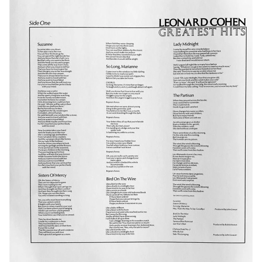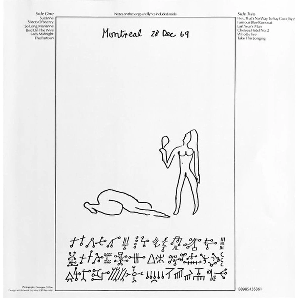 Suzanne, Sisters Of Mercy, So Long, Marianne, Bird On The Wire, Lady Midnight, The Partisan, Hey, That's No Way To Say Goodbye, Famous Blue Raincoat, Last Year's Man, Chelsea Hotel No. 2, Who By Fire, Take This Longing