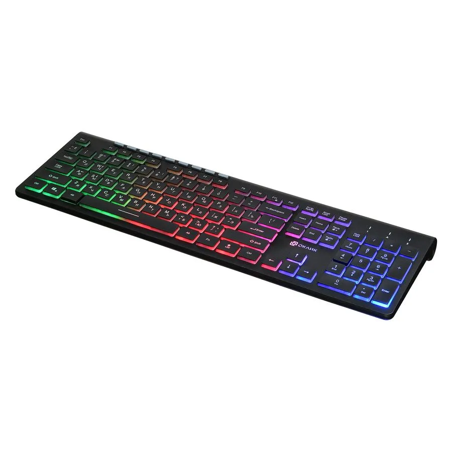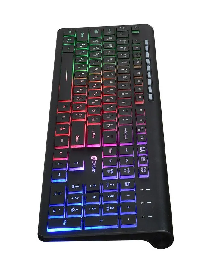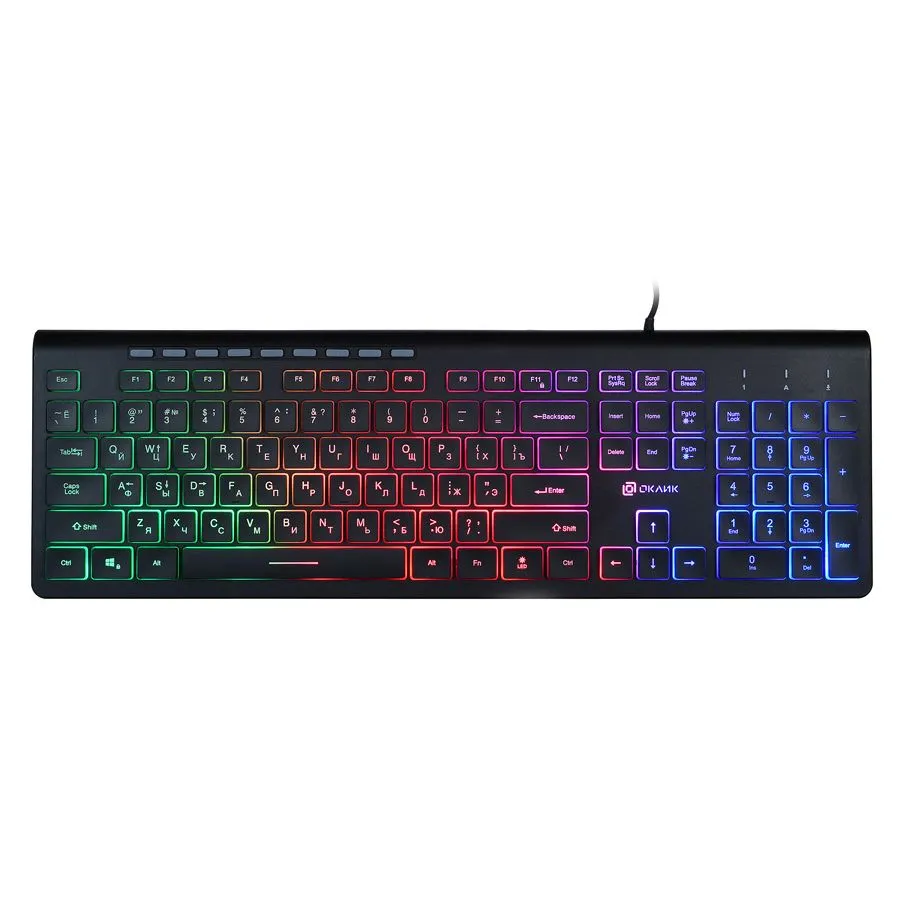 Компьютерная клавиатура Oklick 490ML – стильное и функциональное устройство, которое станет надёжным помощником в работе за компьютером. Особенность Oklick 490ML – мультимедийный функционал клавиш, с помощью которых пользователь управляет файлами прямо с клавиатуры – переключает треки, регулирует громкость и др. Slim-дизайн 490ML делает устройство компактным, что экономит место на рабочем столе. Длина кабеля – 1.5 метра. Клавиатура свободно двигается, и пользователь располагает устройство, как ему удобно. Oklick 490ML оснащена цифровым блоком. USB-интерфейс отвечает за быстрое и надежное подключение к компьютеру. Дизайн клавиатуры выполнен в белом цвете. Английские и русские буквы выделены серым. Клавиши – квадратные, островного типа. Пользователь самостоятельно регулирует многоцветную подсветку, которая создаёт особенную атмосферу во время работы, а также улучшает видимость клавиш в темное время суток.