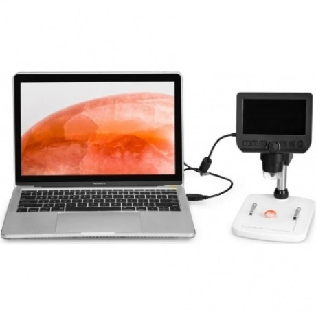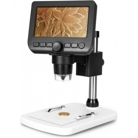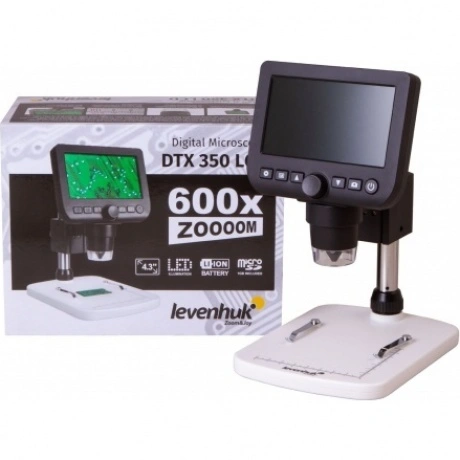 Микроскоп Levenhuk DTX 350 LCD – это цифровые возможности в компактном и стильном корпусе. Этот увеличительный прибор станет отличным выбором для всей семьи. Взрослые смогут использовать его в профессиональной деятельности и для серьезного научного хобби, дети – для подготовки к занятиям в школе и изучения окружающего мира. Микроскоп предназначен для исследования объемных непрозрачных объектов (монет, насекомых, камней) на увеличении от 20 до 600 крат. Основная особенность микроскопа – цифровая камера 0,3 Мпикс. Она формирует картинку и выводит ее на встроенный или внешний экран в режиме реального времени. Диагональ встроенного ЖК-экрана составляет 4,3 дюйма, к внешним мониторам и телевизорам микроскоп подключается при помощи комплектного USB-кабеля. Камера также позволяет записывать видеоролики и делать фотографии исследований. Качество картинки настраивается программно. Если установить на компьютер ПО с диска, прилагаемого к микроскопу, можно получить доступ к дополнительным функциям. Программа позволит настраивать контрастность и яркость картинки, дополнять отснятый материал надписями, измерять размеры образцов – линейные и угловые. Обратите внимание: для сохранения записанных фото и видео требуется карта памяти (включена в комплект поставки). Подсветка микроскопа – 8 ярких светодиодов. Они работают от встроенного аккумулятора, время непрерывной работы на одном заряде составляет около 7 часов. Подзаряжать аккумулятор можно или от сети переменного тока (требуется адаптер, приобретается отдельно), или от USB-порта компьютера.