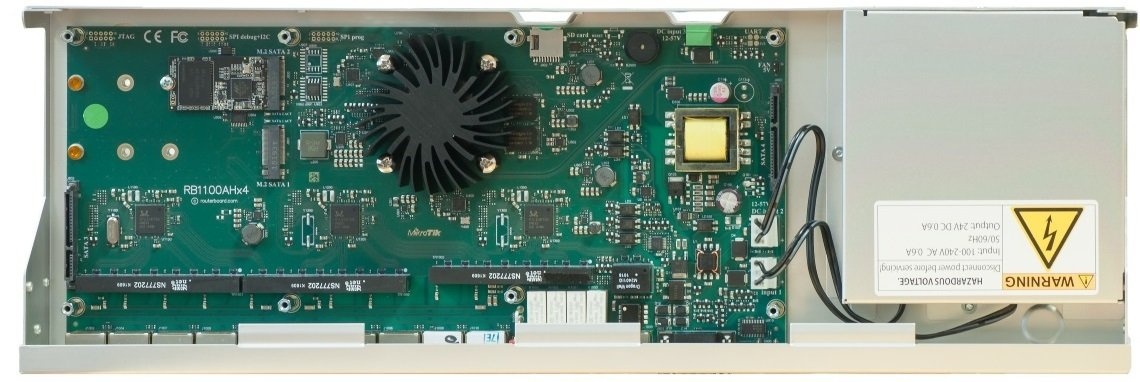 Модель Mikrotik RB1100AHx4 Dude Edition оснащена процессором Annapurna Alpine AL21400 с 4 ядрами Cortex A15 с тактовой частотой 1.4 ГГц, 1 GB оперативной памяти, 13 гигабитными Ethernet портами, несколькими высокоскоростными разъемами для накопителей (2х SATA 3 и 2х M.2), последовательным портом RS232 и двумя блоками питания с функцией резервирования (а также поддержкой питания -48 В DC Telecom и Passive PoE, 802.3af/at), а также предустановленной лицензией RouterOS level 6.