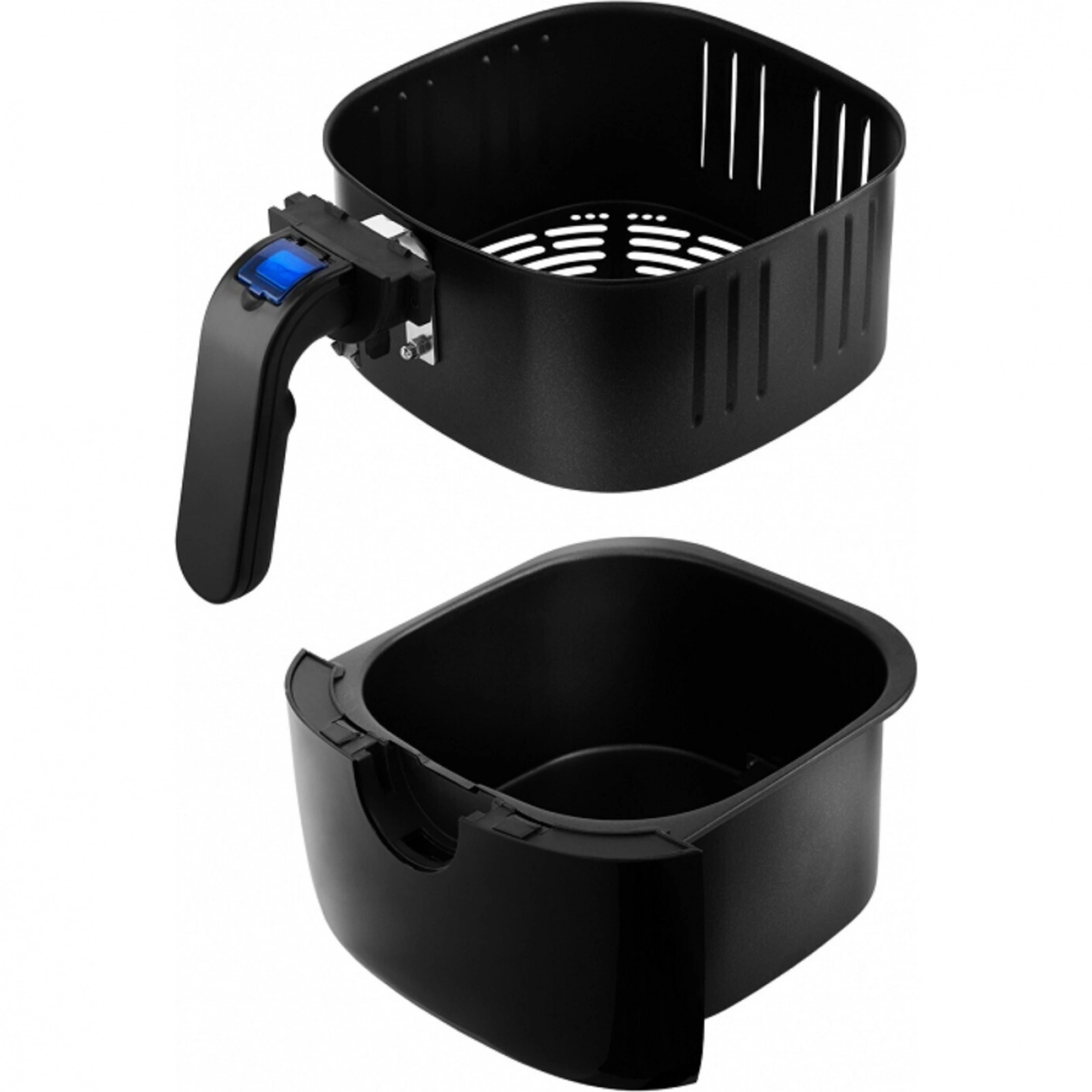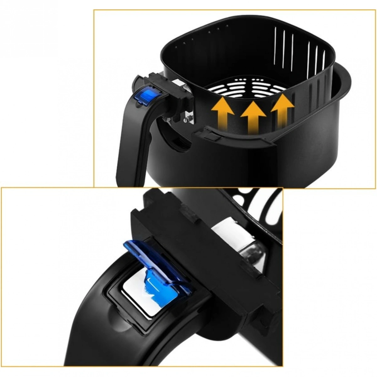 Благодаря системе циркуляции горячего воздуха, продукты обжариваются равномерно со всех сторон, получаясь при этом нежными внутри и с хрустящей корочкой снаружи. Аэрогриль оснащён электронным управлением и дисплеем. Можно настраивать температуру приготовления с шагом в 10 С от 60 до 200 С и время в диапазоне от 1 до 60 мин с шагом 1 мин. Есть таймер отложенного старта от 30 минут до 12 часов. 8 автоматических программ позволят приготовить любимые блюда одним касанием пальца. Съёмный поддон и корзина имеют антипригарное покрытие, благодаря чему они легко отмываются после использования. На ручке есть защита кнопки фиксатора от случайного нажатия.