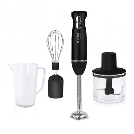Что лучше купить - чоппер, способный быстро измельчить твердые продукты, или универсальный погружной блендер, который не занимает много места? Не тратьте время на муки выбора. Блендерный набор VT-8527 с тремя насадками подходит для любых задач. Мощный (1000Вт) мотор не заставит вас долго ждать результата. Решили приготовить домашний омлет - используйте венчик. Для твердого сыра, чеснока, моркови или орехов есть чоппер. Удобная чаша объемом 0,5 литра точно вместит все ингредиенты, а острые ножи быстро справятся с работой. Менять скорость (всего их две) можно нажимая одну из двух прорезиненных кнопок. Жидкие продукты смешиваются в удобном стакане с ручкой из безопасного пластика.