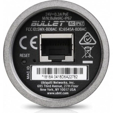 Как и другие устройства Ubiquiti серии Bullet модель не имеет встроенных антенн. Для эксплуатации точки доступа следует использовать внешние антенны подбирающиеся в зависимости от типа создаваемого соединения. К примеру, для развертывания радиомостов подойдут направленные антенны, тогда как для создания небольших по мощности базовых станций оптимальными будут всенаправленные антенны штыревого типа. При этом, благодаря своим малым размерам Bullet AC IP67 просто ввинчивается в антенный разъем, поскольку механической прочности коннекторов N типа вполне достаточно для надежной фиксации подобного компактного устройства. Для максимального удобства настройки Bullet AC IP67 имеет отдельный сервисный WiFi модуль диапазона 2.4 Ггц. Его основно функцией является обеспечение подключения к точке доступа мобильных устройств, для настройки с использованием фирменного приложения UMobile, поскольку далеко не всегда удобно проводить первичное конфигурирование с использованием подключения витой пары. Соединение Bullet AC IP67 с сетью производится через гигабитный Ethernet портом, который поддерживает схему питания 24V Passive PoE, таким образом традиционно для внешнего беспроводного оборудования Ubiquiti обеспечивая питание устройства.