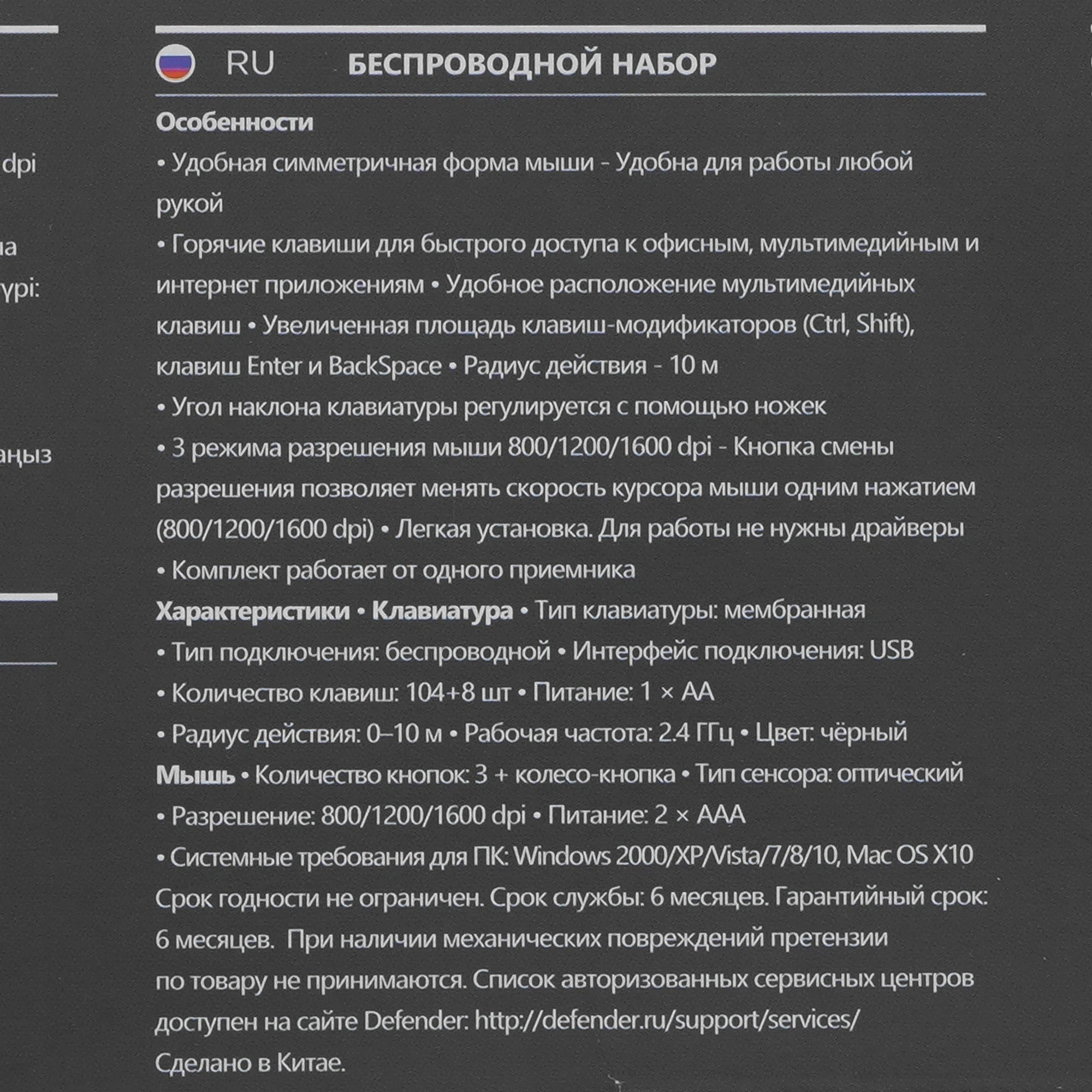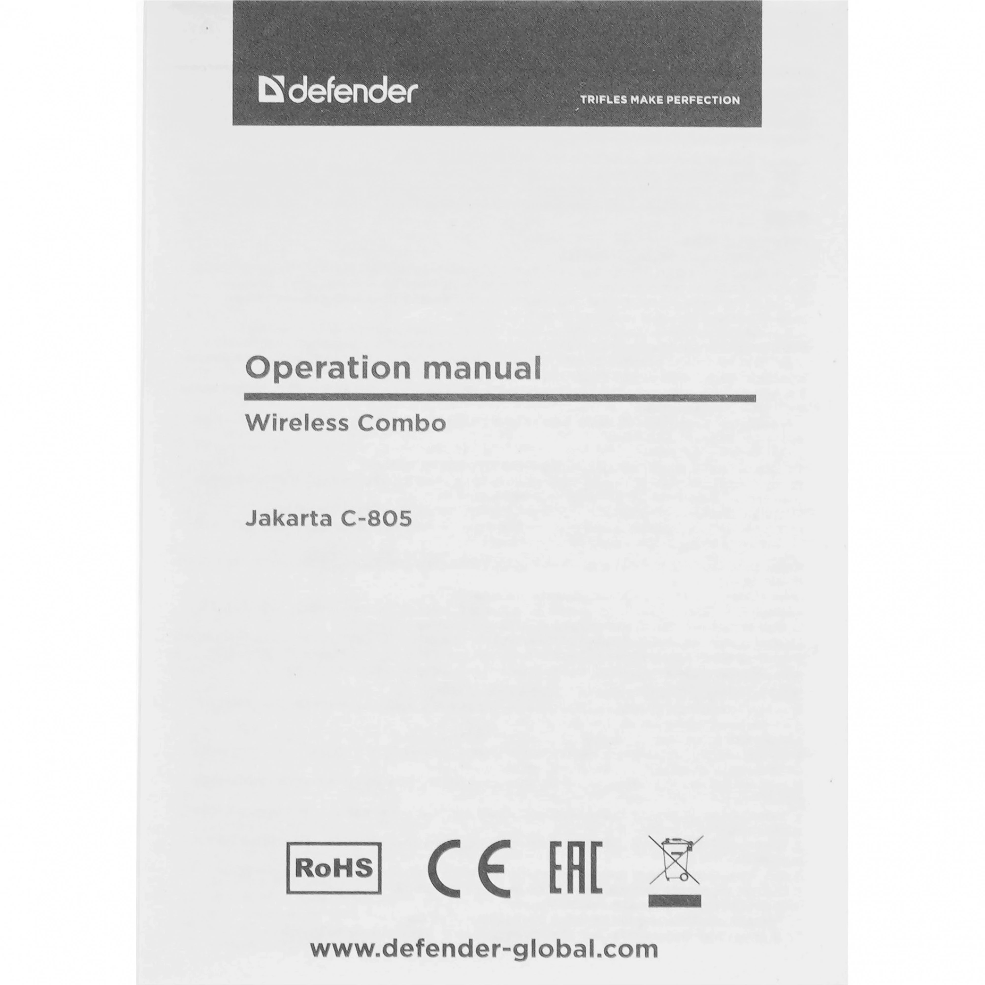 Клавиатура+мышь Defender Jakarta C-805 RU – комплект из двух манипуляторов с беспроводным способом подключения на основе радиоканальной технологии 2.4 ГГц. Мембранный механизм клавиш обеспечивает точное и быстрое распознавание нажатий с низким уровнем шума. Мышь основана на оптическом сенсоре с чувствительностью до 1600 dpi и имеет 3 стандартные кнопки с колесиком прокрутки. В качестве элементов питания используются батарейки стандарта АА. Корпус устройств Defender Jakarta C-805 изготовлен из прочного пластика с классической расцветкой и практичной фактурой.