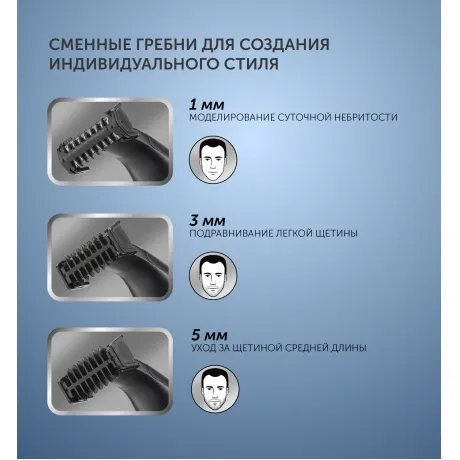 Подходит для стрижки бороды, усов, волос на теле. 3 в 1: бритье, подравнивание, четкий контур. Высокоуглеродистая нержавеющая сталь. 3 сменных гребня: 1, 3, 5 мм. Минимальная длина стрижки 0,1 мм. 120 минут работы от аккумулятора. Возможность зарядки от USB. 1,5 часа для полного заряда. Li-ion батарея. Технология влагозащиты IPX5 WaterProof. Возможность бритья в душе. Сухое и влажное бритье. Сумочка для хранения. Щеточка для чистки. Масло для ухода.