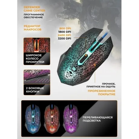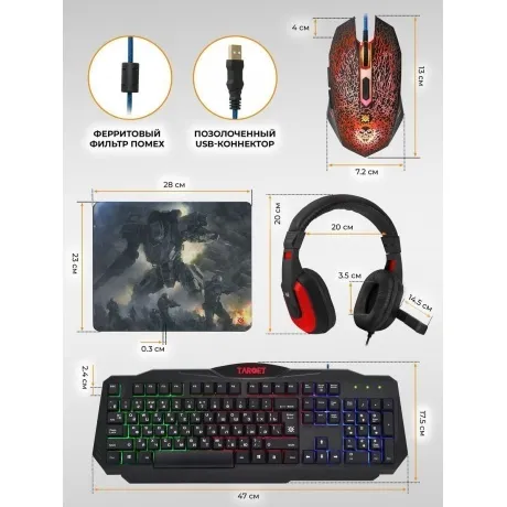 Игровой набор включающий в себя клавиатуру, мышку, гарнитуру и коврик. Мышь с переливающейся подсветкой и возможностью смены DPI: 4 режима разрешения 800/1800/2400/3200 dpi. Редактор макросов. Прочное, приятное на ощупь прорезиненное покрытие. Стабильная работа на высоких скоростях: сенсор фиксирует скоростное, до 1 м/с, перемещение мыши по любой поверхности. Он делает 3600 снимков поверхности в секунду (3600 FPS), что дает возможность перемещать мышь с ускорением до 8 G (78 м/сек2). 5 программируемых кнопок, 2 из которых боковые. Увеличенная ширина колесика и специальный рисунок протектора облегчают управление мышью. Расположение колеса оптимально для мгновенного переноса указательного пальца на колесо во время игры. Коврик тканевый, гладкое покрытие. Точное позиционирование курсора и оптимальное трение. Нескользящая каучуковая основа надежно фиксируется на любой поверхности. Оптимальная толщина ковра 3 мм - это отличное шумопоглощение при приземлении мыши и сглаживание мелких неровностей поверхности стола. Клавиатура с классической раскладкой и радужной подсветкой. Наушники закрытого типа с регулируемым оголовьем и регулятором громкости. Откидной микрофон. Подключение к компьютеру 2 штекера miniJack 3.5мм.