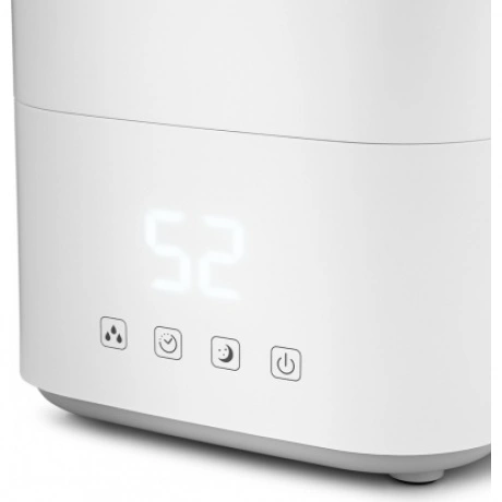 Работает тихо. Есть почасовой таймер отключения, и очень важно , что при низком уровне воды , срабатывает зашита и после трех звуковых сигналов увлажнитель отключается.