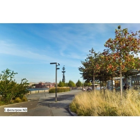 Hoya PRO ND100 относится к фильтрам высокой плотности (6 2/3 ступени). Обычно применяется для защиты от переэкспонирования, когда требуется снять ярко освещенный объект с максимально открытой диафрагмой (для достижения малой глубины резкости) и когда нужно снимать днем с длинной выдержкой для размытия движущихся объектов (в фото) и для обеспечения корректной скорости затвора в видео. Двухстороннее металлсодержащее покрытие ACCU-ND обеспечивает не только равномерное снижение светопропускаемости, но и отсутствие цветового сдвига при смене одного Pro ND фильтра на другой (с большей или меньшей плотностью). Благодаря использованию качественно отполированного минерального стекла разрешающая способность оптики сохраняется в полной мере. Оправа фильтра выполнена из алюминия. ND фильтры обрели новую жизнь при росте популярности видеосъемки на зеркальные и беззеркальные системные фотокамеры. Дело в том, что в нормальной ситуации при съемке видео значение скорости затвора (в 1/x) не должно быть выше чем [частота кадров х 2]: т.е. 1/50 - 1/60 с для 24-30 кадров в секунду или 1/100 - 1/120 для 50-60 кадров в секунду. Слишком короткая выдержка приводит к заметным глазу рывкам, отрывистому движению без плавного перехода между кадрами. Итак, ясный день, много света, вы не хотите поднимать скорость затвора, не хотите закрывать диафрагму (чтобы сохранить эффект размытия фона), и не можете опустить ISO, поскольку уже уперлись в минимальное значение. Остается одно - ограничить светопропускаемость с помощью ND фильтра. В профессиональных видеокамерах такие фильтры встраиваются прямо в корпус, а при использовании фотоаппаратов их нужно приобретать отдельно.