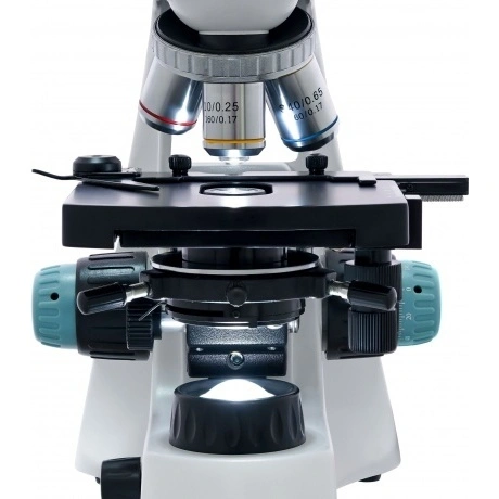Тринокулярный микроскоп Levenhuk 400T предназначен для лабораторных работ с биологическими образцами. Он дает увеличение в диапазоне от 40 до 1000 крат и позволяет использовать метод светлого поля и масляную иммерсию. Все наблюдения ведутся в проходящем свете. Микроскоп станет достойным дополнением к арсеналу необходимой техники в медицинском или научно-исследовательском учреждении. В микроскопе установлена тринокулярная насадка. Она поворотная – вращается на 360°, визуальный узел имеет небольшой наклон в 30°, а в вертикальную окулярную трубку можно установить цифровую камеру (нет в комплекте). Оптика ахроматическая и широкопольная. Окуляры дают 10-кратное увеличение, объективы приближают в 4, 10, 40 и 100 раз. У объективов 40х и 100х есть пружинящие оправы, защищающие переднюю линзу от случайного повреждения. Для масляной иммерсии используется объектив 100х. Резкость оптики настраивается ручками грубой и точной фокусировки.