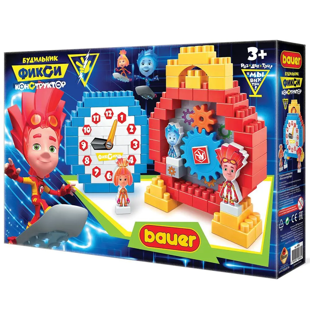 Конструктор от компании Bauer создан по мотивам мультфильма Фиксики. Набор содержит в себе 99 деталей, 3 из которых – это фигурки фиксиков. Дополнительно в комплект входят наклейки, они являются частью циферблата будущего будильника. Сборка конструктора происходит так: в корпус будильника со стенкой красного цвета монтируются детальки с выступами, на которые, в свою очередь, устанавливаются шестеренки. Элементы сделаны из высококачественного пластика с использованием пищевых красителей.