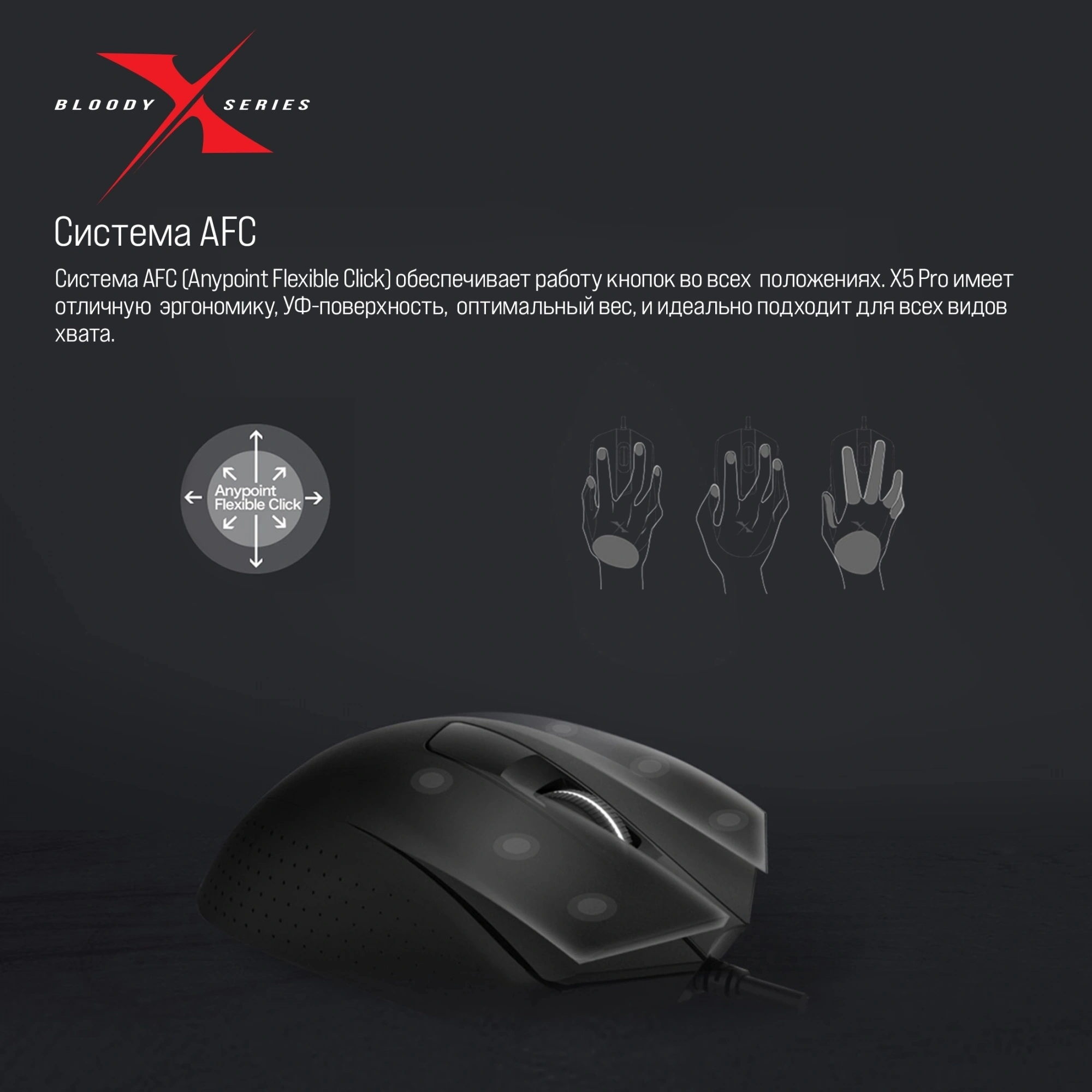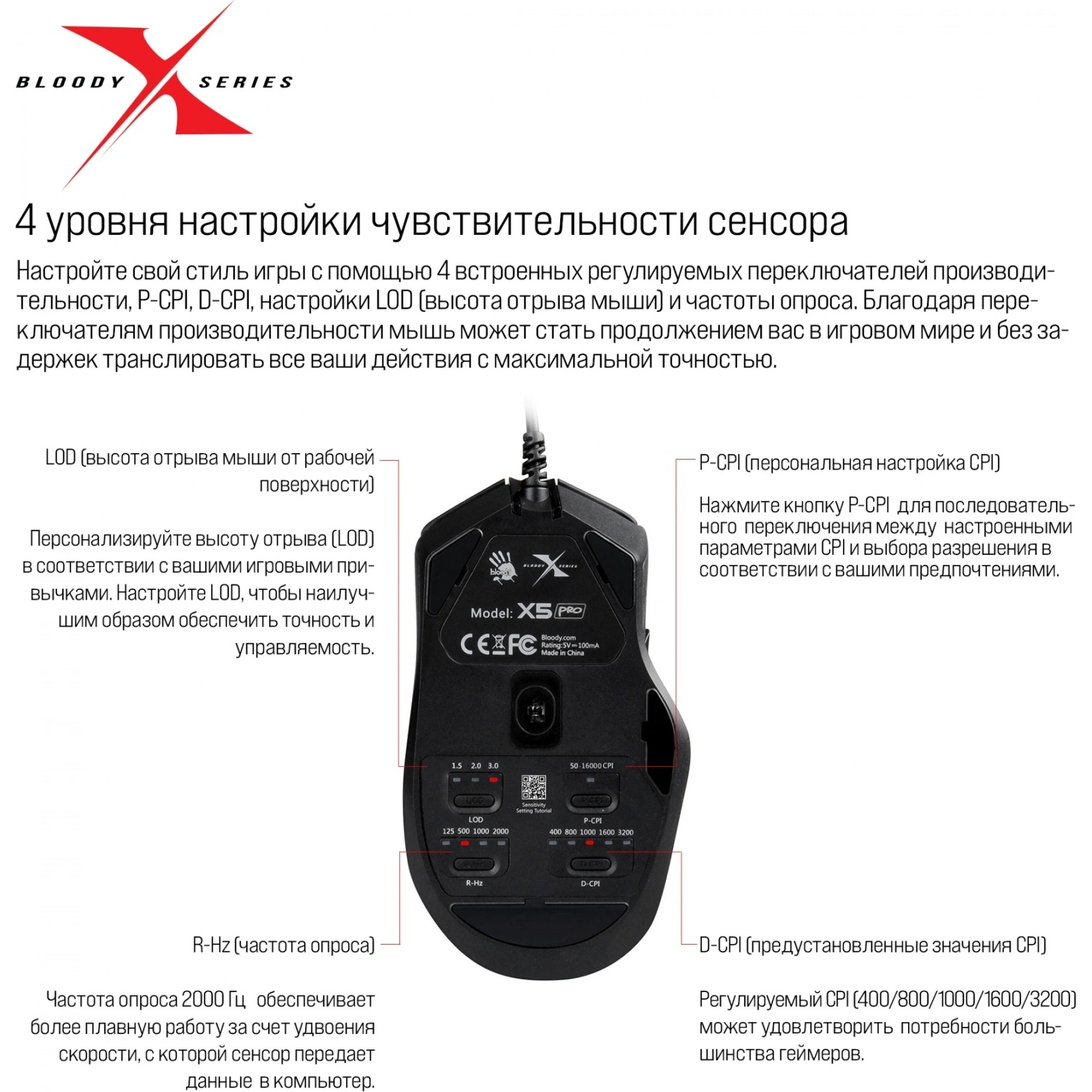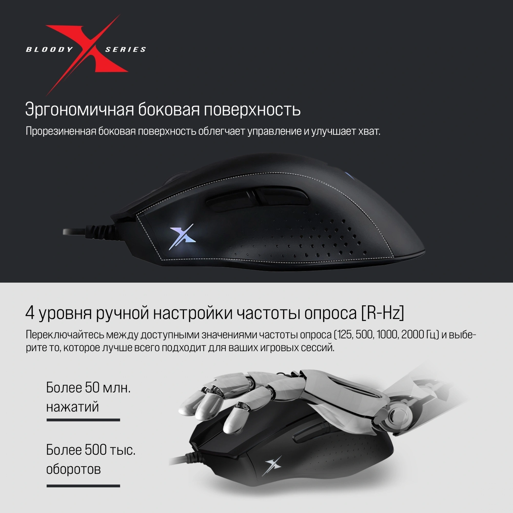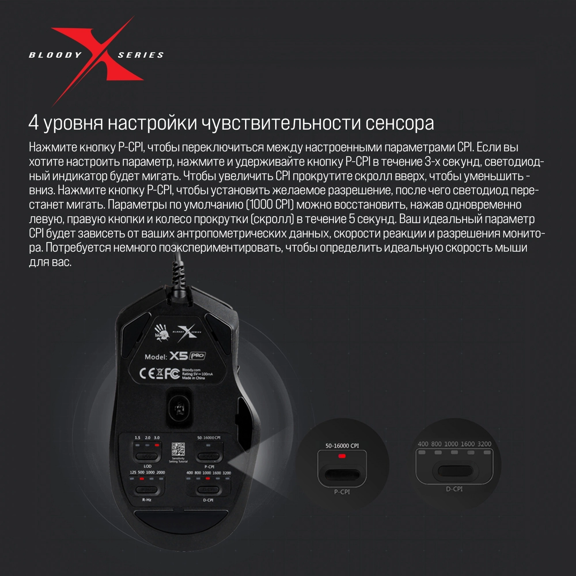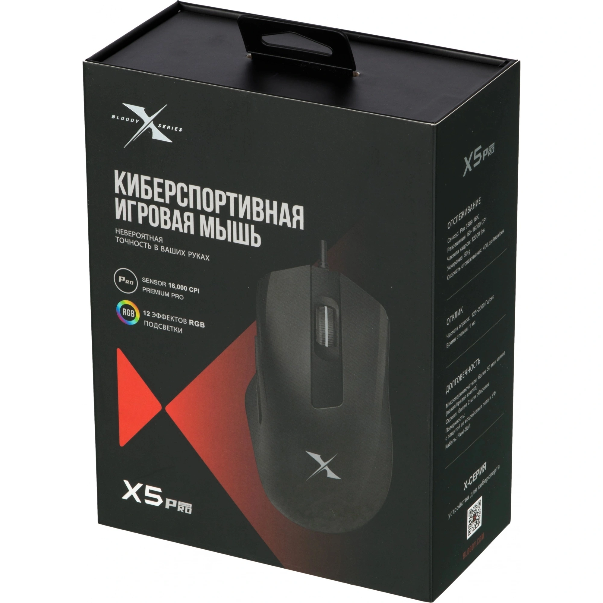 A4 Bloody X5 PRO это киберспортивная мышь. Благодаря профессиональному сенсору Pro 3389с высоким разрешением 16000 CPI, частотой кадров 12000 FPS, скоростью отслеживания 400 IPS и ускорением 50g, а также четырем настройкам производительности, мышь обеспечивает точность и управляемость там, где нужна быстрота реакции. Индивидуальная настройка и пять предустановленных значений CPI обеспечивают исключительную точность отслеживания и последовательное реагирование на любой скорости. Модель отличается молниеносной реакцией: скорость отклика составляет всего одну миллисекунду. Четыре уровня частоты опроса дают возможность переключаться между доступными значениями (125, 500, 1000, 2000 Гц) и выбирать именно то, которое лучше всего подходит для конкретной игровой сессии. Прочное колесо прокрутки отвечает за тактильный комфорт во время игры, а также обеспечивает долговечность устройства. Для эргономичной и удобной посадки руки предусмотрено противоскользящее покрытие боковых поверхностей. RGB подсветку можно настроить по желанию, выбрав любой из 12 эффектов.