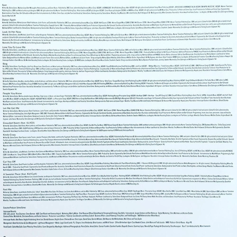 Rare, Dance Again, Look At Her Now, Lose You To Love Me, Ring, Vulnerable, People You Know, Let Me Get Me, Crowded Room, Kinda Crazy, Fun, Cut You Off, A Sweeter Place