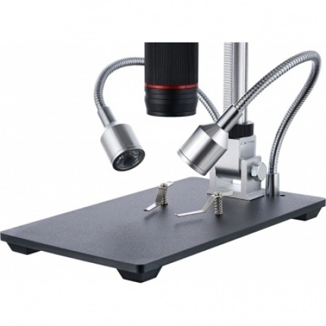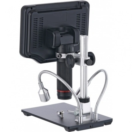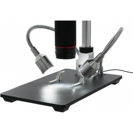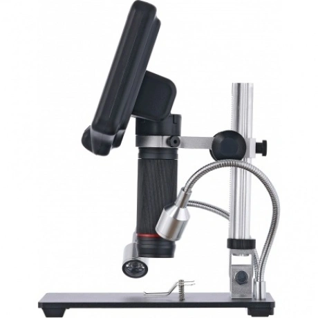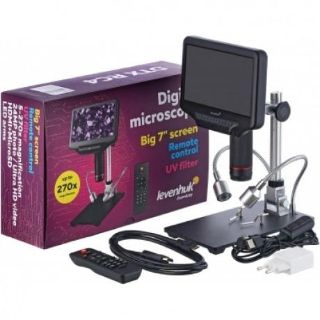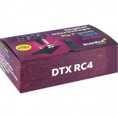 Микроскоп с дистанционным управлением Levenhuk DTX RC4 – это микроскоп для наблюдений и создания цифровых архивов с высококачественными фотографиями и видеороликами. Картинку можно выводить на внешний экран, а для управления использовать беспроводной пульт. Микроскоп удобен при работе в мастерской, сервисном центре или дома. Большой ЖК-экран с возможностью наклона. Микроскоп выводит изображение на встроенный экран. Это большой ЖК-экран с диагональю 7 дюймов (около 18 см). Картинка цветная, хорошо детализированная. При необходимости к прибору можно подключить монитор или телевизор через кабель HDMI (в комплекте). Для исследований можно применять цифровое или оптическое увеличение. Общий диапазон кратности составляет от 5 до 270 крат, оптический диапазон – от 5 до 40 крат. Микроскоп дает возможность фотографировать и записывать видео, причем в ультравысоком качестве. Для фотографий это разрешение 5600х4200 пикс, для видео – Ultra HD. Обратите внимание и на кадровую частоту роликов – от 24 до 120 кадров в секунду (зависит от выбранного разрешения). Запись ведется на карту памяти, которая не входит в комплект поставки. Подсветка находится над предметным столиком и реализована крайне интересно. Это два отдельно расположенных светодиода, закрепленные на гибких держателях. Благодаря этому свет можно направить на образец под любым углом, осветив даже труднодоступные области. Яркостью подсветки можно управлять при помощи переключателя на кабеле питания. Там же находится и кнопка включения/выключения прибора. Для управления микроскопом можно использовать кнопки на корпусе или беспроводной пульт. В пульт заложено много функций, поэтому работать с прибором удобно даже на удалении от него. С пульта можно регулировать яркость подсветки, настраивать увеличение, запускать запись видео, делать фотоснимки и многое другое. Основные особенности: Доступно оптическое и цифровое увеличение. Изображение выводится на встроенный ЖК-экран в цвете. Большая диагональ (7 дюймов), возможность наклона экрана. Фотографирование и видеозапись в ультравысоком разрешении. Подключение к внешним устройствам: монитору или телевизору. Подсветка представлена светодиодами на гибких держателях. Пульт дистанционного управления дает доступ к множеству функций – удобно при проведении групповых наблюдений. Комплектация: ЖК-экран, штатив, основание с зажимами, осветители на гибких держателях, инфракрасный пульт дистанционного управления, ультрафиолетовый фильтр, кабель питания с переключателем и регулятором яркости подсветки, кабель HDMI, сетевой адаптер, инструменты и крепеж, инструкция по эксплуатации и гарантийный талон.