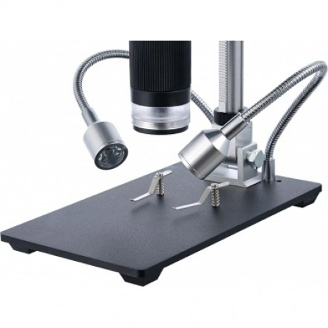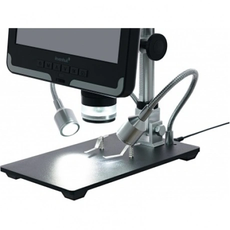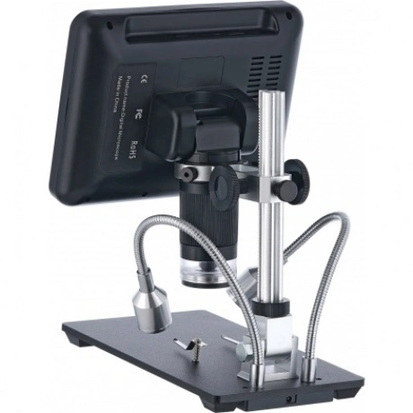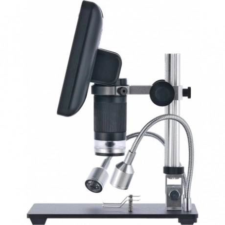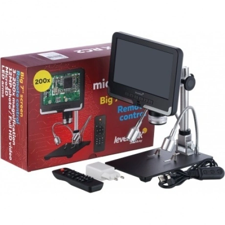 Микроскоп с дистанционным управлением Levenhuk DTX RC2 – незаменимый увеличительный прибор для работы в ремонтной мастерской или сервисном центре. Он будет удобен при диагностировании поломок в механизмах и электроплатах, оценке ювелирных изделий, изучении сварных швов и припоя. Микроскоп также позволяет делать фотографии и записывать видео, а управлять прибором можно при помощи беспроводного пульта. Диагональ встроенного ЖК-экрана составляет 7 дюймов – это около 18 см. Такой размер обеспечивает хороший обзор и позволяет рассматривать протяженные области с максимальным комфортом. Экран можно наклонять, что также удобно при длительных наблюдениях. Картинка выводится в цвете и с хорошей детализацией. Для исследований можно использовать оптическое или цифровое увеличение. Общий диапазон кратности составляет от 3 до 200 крат. Также микроскоп можно использовать для создания фото- и видеоархивов, причем качество снимков будет очень высоким. Для фотографий можно выбрать разрешение до 12 Мпикс, для видео – Full HD. Запись ведется на карту памяти (не входит в комплект поставки). Подсветка состоит из нескольких элементов. Часть светодиодов находится внутри объектива. Также есть два отдельных светодиода, которые закреплены на гибких держателях. Такое расположение источников освещения позволяет наиболее точно направить свет. Яркость подсветки можно регулировать. Для удобства кнопки регулировки яркости вынесены на небольшой переключатель, расположенный на кабеле питания. Здесь же находится и кнопка включения/выключения прибора. Кнопки управления микроскопом размещены на передней панели под ЖК-экраном, но также они продублированы на беспроводной пульт. Он позволяет регулировать увеличение, настраивать яркость подсветки, работать с фото и видео и многое другое. Основные особенности: Доступно оптическое и цифровое увеличение. Изображение выводится на встроенный ЖК-экран в цвете. Большая диагональ (7 дюймов), возможность наклона экрана. Можно фотографировать и записывать видео в высоком разрешении. Подсветка представлена светодиодами на гибких держателях и внутри объектива. Пульт дистанционного управления дает доступ к множеству функций. Комплектация: ЖК-экран, штатив, основание с зажимами, осветители на гибких держателях, инфракрасный пульт дистанционного управления, ультрафиолетовый фильтр, кабель питания с переключателем и регулятором яркости подсветки, сетевой адаптер, инструменты и крепеж, инструкция по эксплуатации и гарантийный талон.