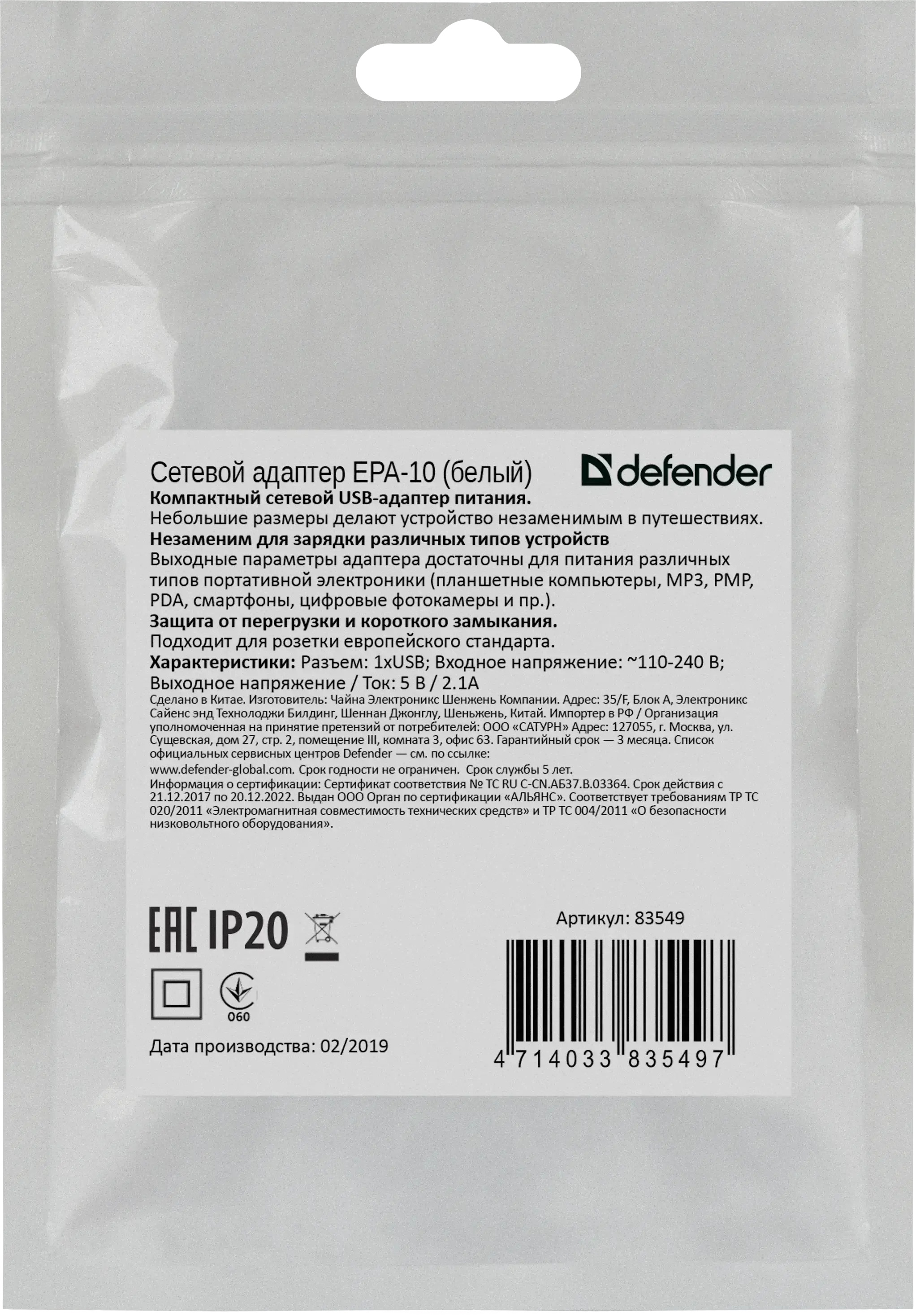 Сетевое зарядное устройство Defender EPA-10 (83549) купить с доставкой в Москве