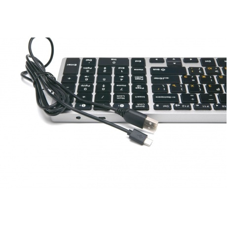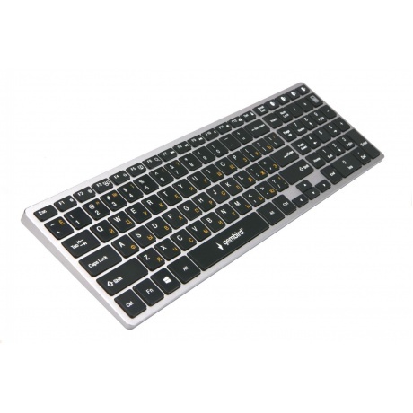Беспроводная Bluetooth-клавиатура. Ножничный (бесшумный) механизм клавиш. Встроенный аккумулятор. Возможность сопряжения с четырьмя устройствами. Клавиши управления громкостью.