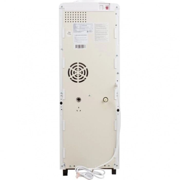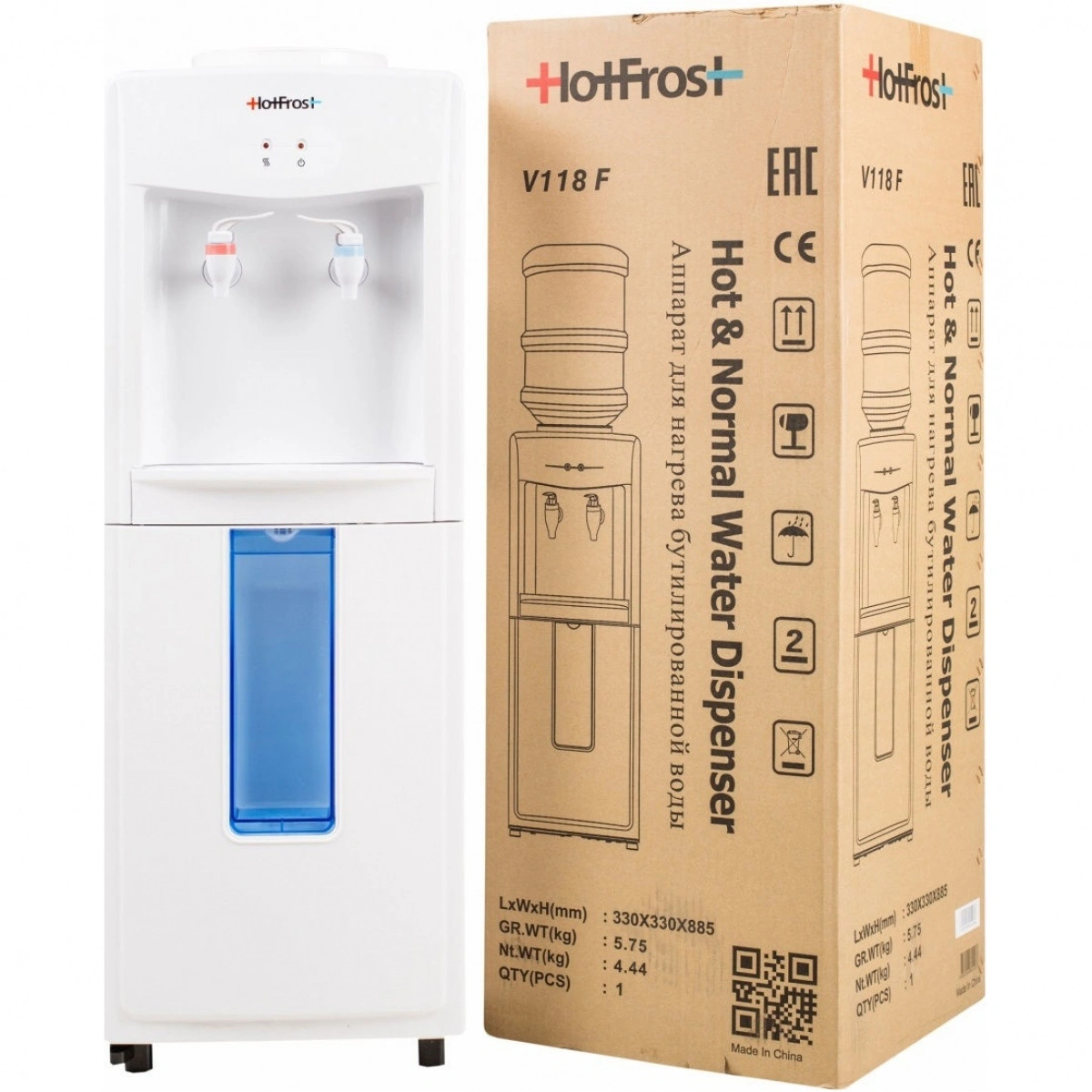 Диспенсер HotFrost V118F представляет собой удобное устройство, выполненное в белом корпусе размерами 29.5x85.5x29.5 см, которое позволяет нагревать и раздавать бутилированную воду. Конструкция модели предусматривает наличие двух краников: кран с красной полосой используется для раздачи горячей воды, а вот из краника с синей полосой вы сможете получить воду комнатной температуры. Кулер устанавливается на пол и обладает удобной индикацией, что позволяет следить за состоянием прибора. Индикаторы отображают работу устройства и режим нагрева. Для горячей воды HotFrost V118F оборудован небольшим резервуаром, объем которого равен 1.02 л. Диспенсер способен быстро нагреть воду до температуры 95 °С при поддержке мощности 420 Вт. За час прибор способен нагревать до 4 литров воды, поддерживая ее температуру, чтобы вы могли всегда получить воду для горячего кофе или чая. Получить воду из краника можно, если нажать на него кружкой. Это позволит избежать ожогов.