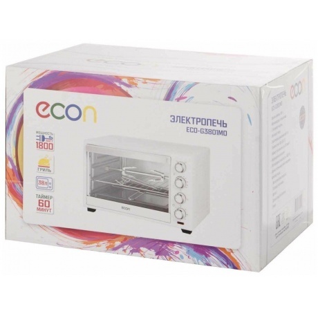 Электропечь ECON ECO-G3801MO имеет внутренний объем 38 л и мощность 1800 Вт. Прибор способен полноценно заменить духовой шкаф, включая в себя 6 различных режимов работы. Таймер на 60 минут оповестит об окончании приготовления блюда и прибор выключится.