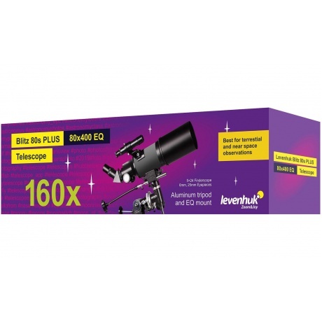 Телескоп Levenhuk Blitz 80s PLUS представляет собой небольшой оптический прибор для астрономических и наземных наблюдений. Он собран по схеме ахроматического рефрактора, имеет короткое фокусное расстояние и, как следствие, широкое поле зрения. Так как оптическая труба небольшого размера, телескоп удобно брать с собой в поездки и на астрофесты за город.