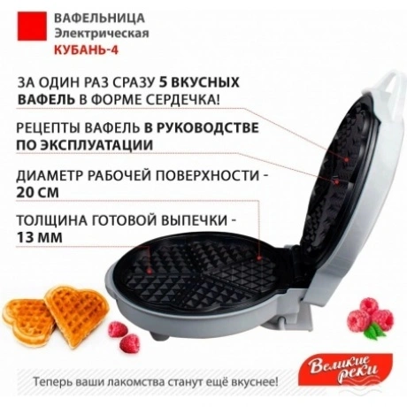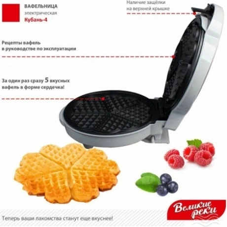 Вафельница электрическая Великие Реки Кубань-4 – устройство, в котором можно приготовить одновременно пять пышных венских вафель в форме сердечек.