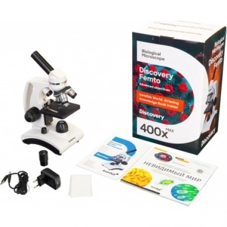 Discovery Femto Polar – монокулярный микроскоп для наблюдений в отраженном и проходящем свете с применением метода светлого поля. Он дает увеличение в диапазоне от 40 до 400 крат, что позволяет проводить множество исследований, причем как готовых микропрепаратов, так и самостоятельно изготовленных образцов. С его помощью можно увидеть простейших, крошечных водных обитателей, мелкие структуры растительных и животных тканей. Также в комплектацию включена познавательная книга о микромире.