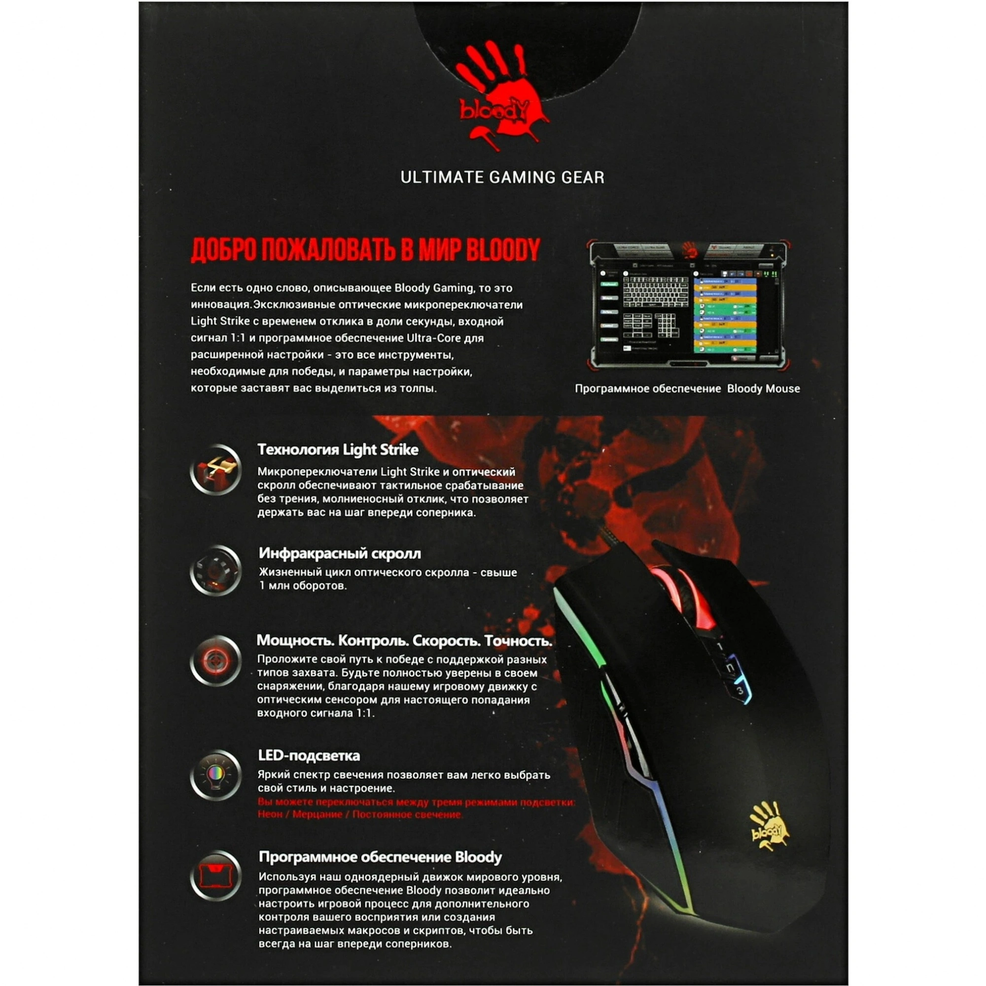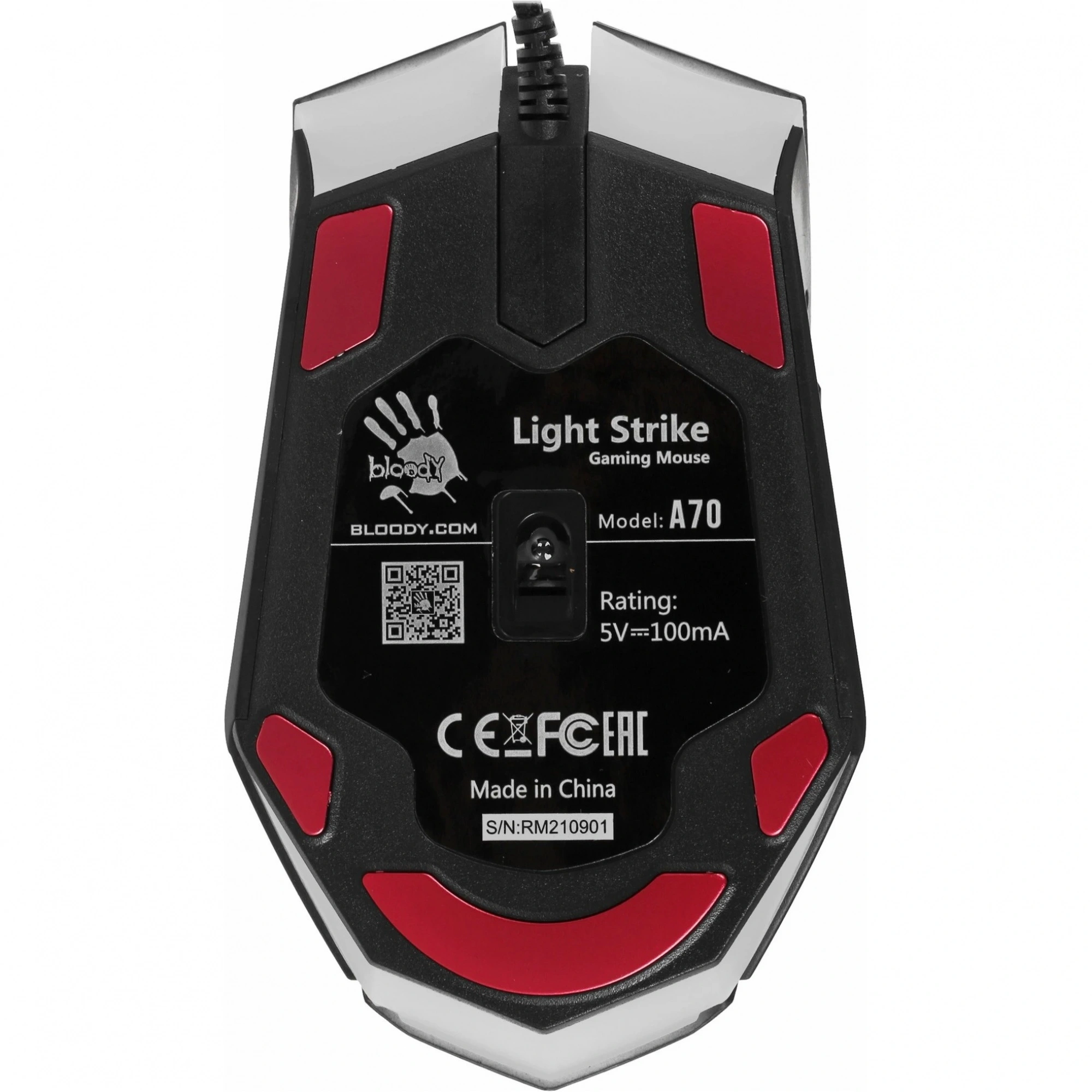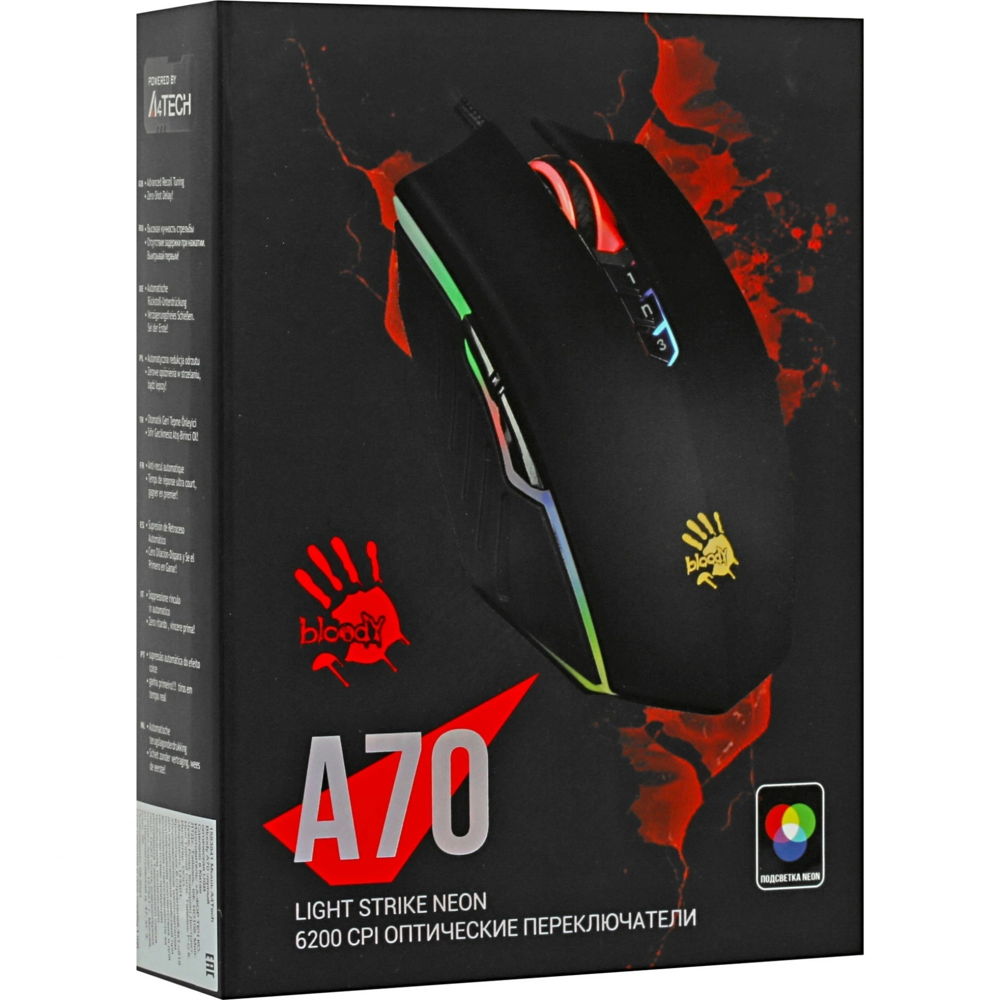 Мышь игровая A4TECH Bloody A70 игровая мышь с проводным подключением и симметричным дизайном корпуса. Одной из главных особенностей A4 Tech Bloody A70 является оптико-механическое устройство основных кнопок. В роли системы переключателей используется Light Strike, время отклика данной механики составляет 0,2 мс. Сами кнопки рассчитаны на высокие механические нагрузки, чему поспособствовал рабочий ресурс переключателей в 50 млн активаций, в то время как колесико скролинга рассчитано на 1 млн полных оборотов. Всего на борту манипулятора предусмотрены 7 кнопок. А используя фирменное ПО, кнопки можно переназначать в любом порядке. Также предусмотрено создание сложных макрокоманд, все настройки сохраняются во внутренней памяти мышки, что избавляет от необходимости установки ПО на новых компьютерах, если мышка на них будет использоваться. Программа позволяет провести настройку разрешающей способности сенсора. Если того требует ситуация, можно активировать режим калибровки мышки под отдельно взятый коврик. Лицевая поверхность модели оснащена эффектным принтом, который вдобавок ко всему еще и подсвечивается.