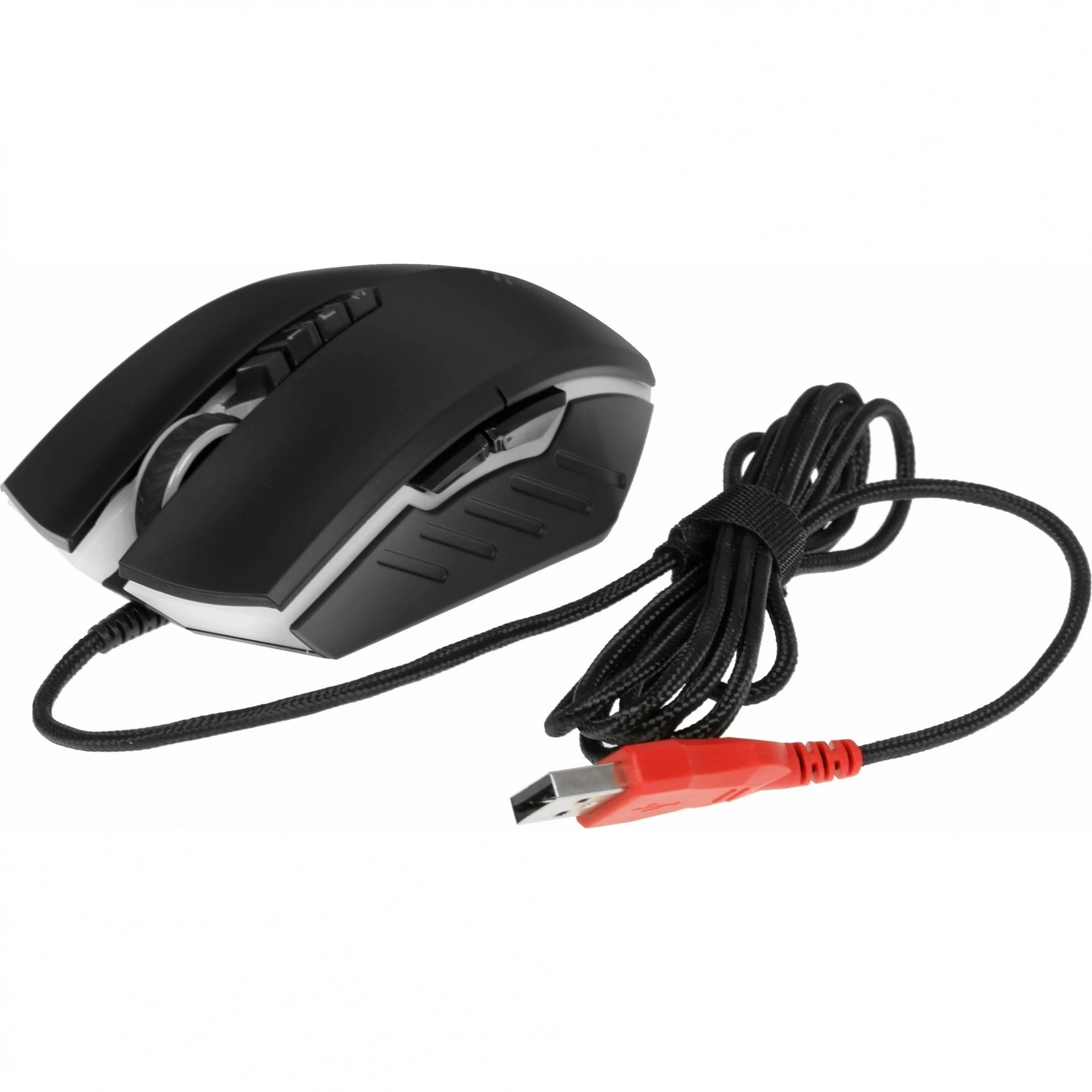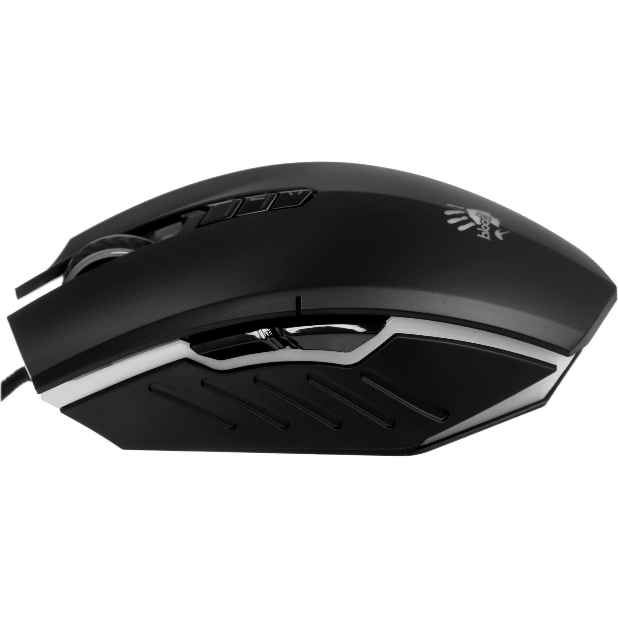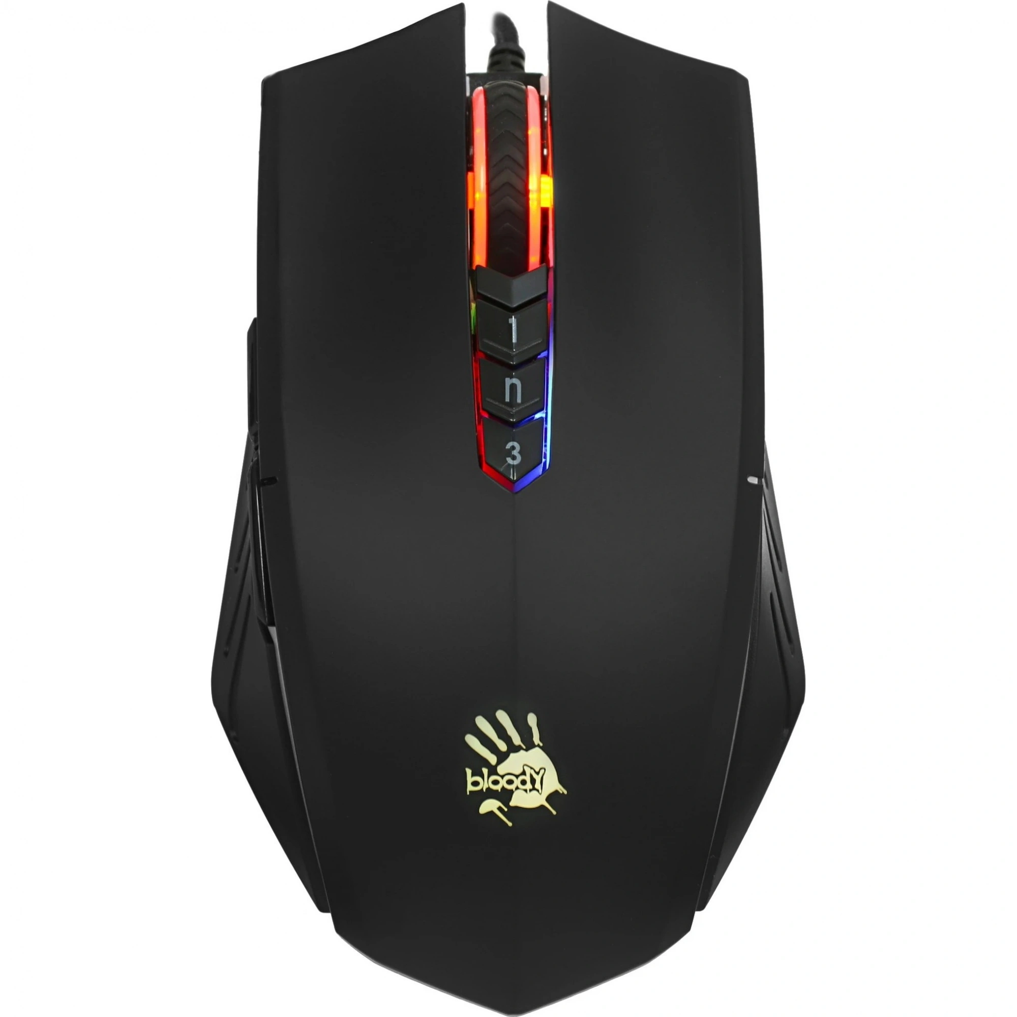 Мышь игровая A4TECH Bloody A70 игровая мышь с проводным подключением и симметричным дизайном корпуса. Одной из главных особенностей A4 Tech Bloody A70 является оптико-механическое устройство основных кнопок. В роли системы переключателей используется Light Strike, время отклика данной механики составляет 0,2 мс. Сами кнопки рассчитаны на высокие механические нагрузки, чему поспособствовал рабочий ресурс переключателей в 50 млн активаций, в то время как колесико скролинга рассчитано на 1 млн полных оборотов. Всего на борту манипулятора предусмотрены 7 кнопок. А используя фирменное ПО, кнопки можно переназначать в любом порядке. Также предусмотрено создание сложных макрокоманд, все настройки сохраняются во внутренней памяти мышки, что избавляет от необходимости установки ПО на новых компьютерах, если мышка на них будет использоваться. Программа позволяет провести настройку разрешающей способности сенсора. Если того требует ситуация, можно активировать режим калибровки мышки под отдельно взятый коврик. Лицевая поверхность модели оснащена эффектным принтом, который вдобавок ко всему еще и подсвечивается.