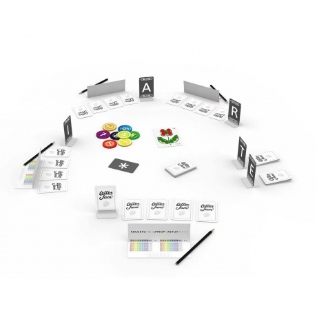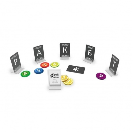 68 карт букв, карта-джокер, 8 утяжеленных покерных фишек с цифрами, 6 красных пластиковых маркеров, 9 зеленых пластиковых маркеров, 6 подставок под карты, 6 карандашей, блокнот для записи догадок, 4 памятки для подготовки, правила