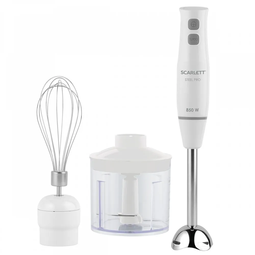 Блендер Scarlett SC-HB42F84 способен заменить сразу несколько кухонных приборов. Сливки, яичные белки взобьёт венчик, он же поможет в замешивании лёгкого теста, например, для блинчиков. Измельчитель (500 мл) быстро подготовит овощную поджарку для супа, мясо для запеканки или порубит орехи. Погружная насадка сделает пюре, такое однородное и нежное, что его можно будет использовать даже для детского питания. В особенно сложных случаях поможет режим «Турбо». Благодаря мощности 850 Вт самые трудоёмкие задачи будут решены за считаные секунды. Венчик, мини-измельчитель и погружную насадку можно мыть в посудомоечной машине.