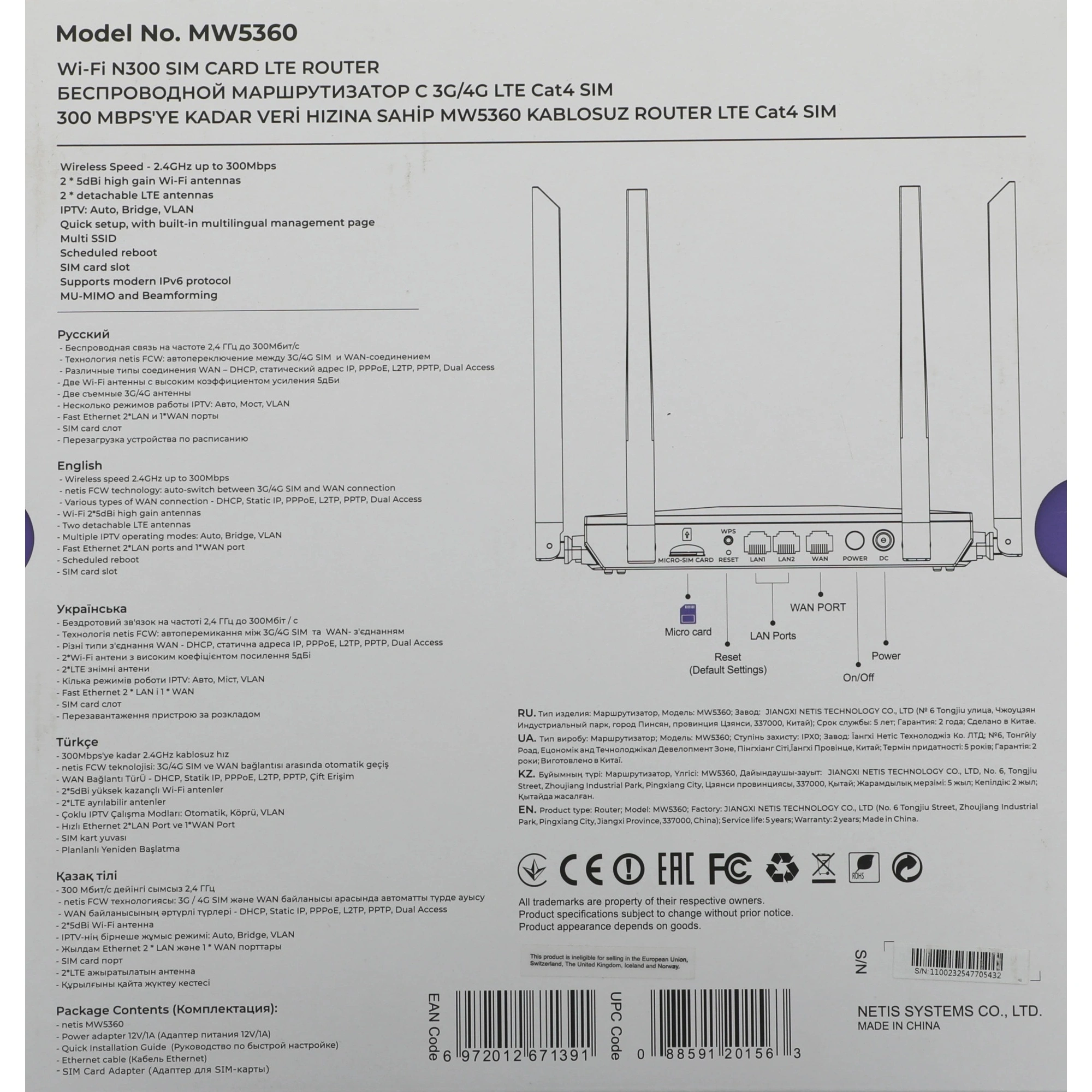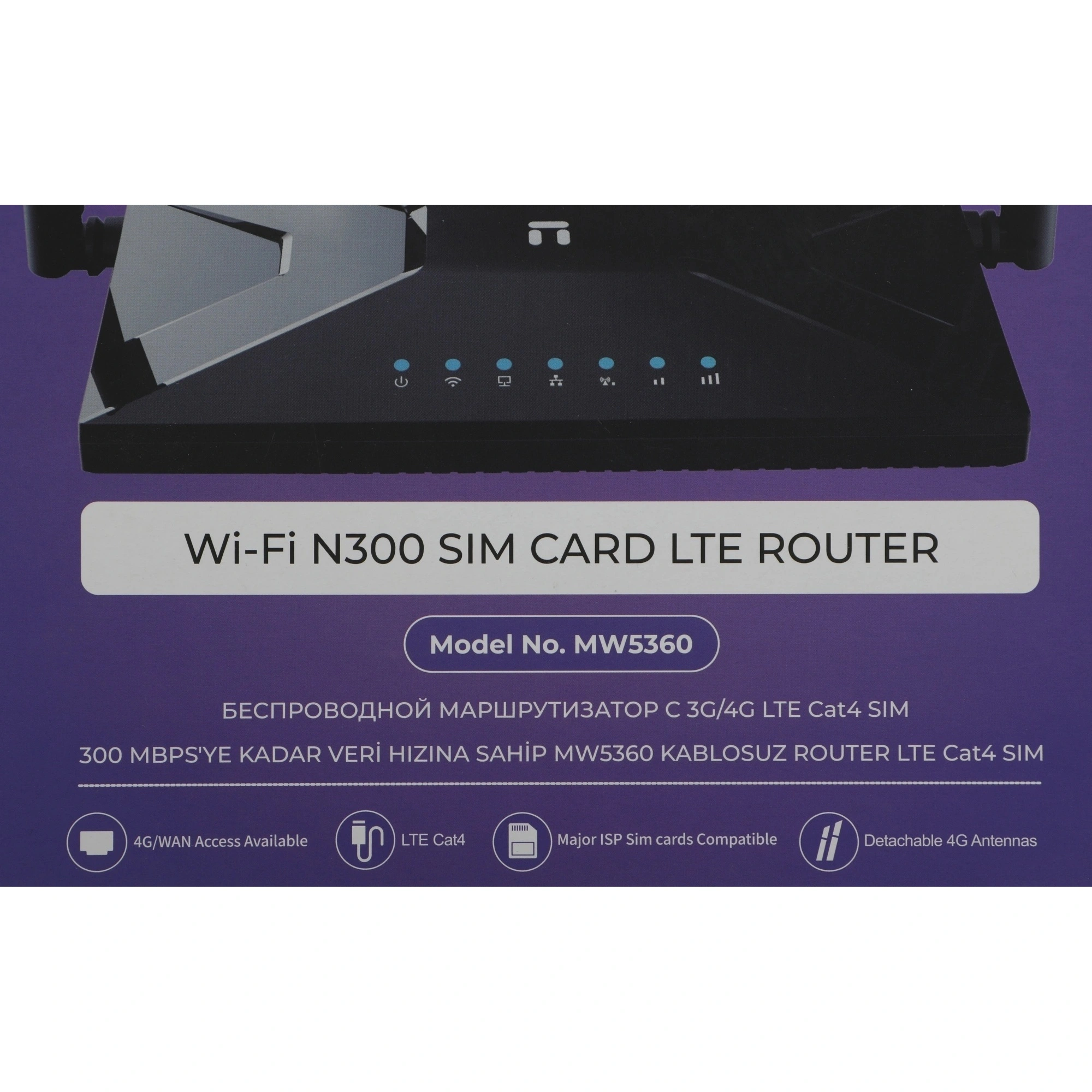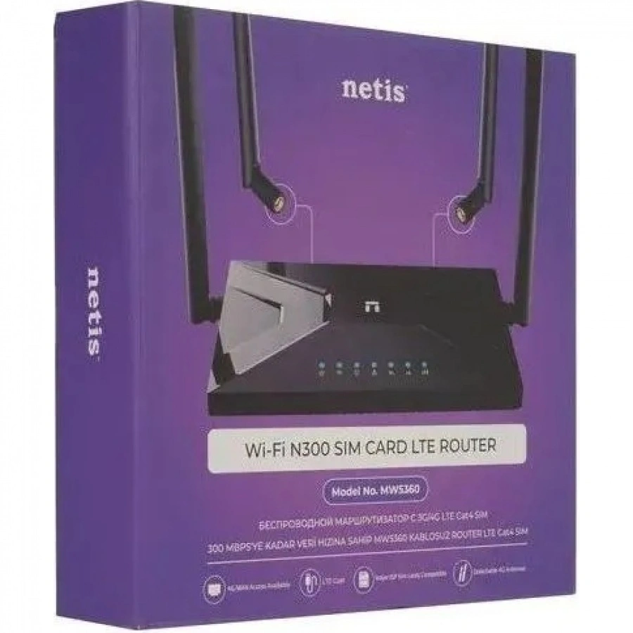 LTE маршрутизатор Netis MW5360 оснащен модулем 4G LTE, который позволяет выходить в Интернет с помощью SIM-карты. Благодаря отдельным антеннам Wi-Fi и уникальной конструкции съемных LTE антенн, он позволяет размещать 4G антенны в любом месте дома или за его пределами, что обеспечивает более высокую скорость 4G и лучшую производительность Wi-Fi. Netis MW5360 также предлагает проводной порт WAN для использования в качестве обычного беспроводного маршрутизатора.