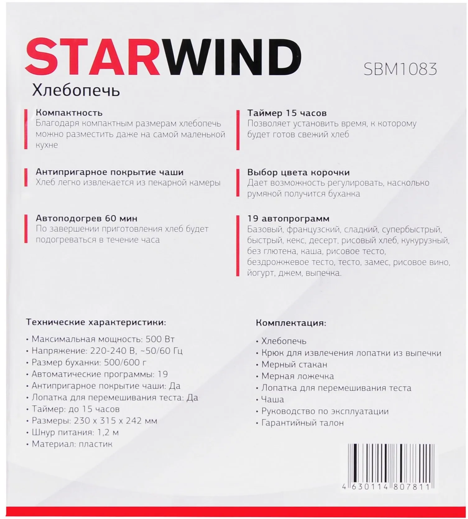 Описание товара Хлебопечь Starwind SBM1083 500Вт черный