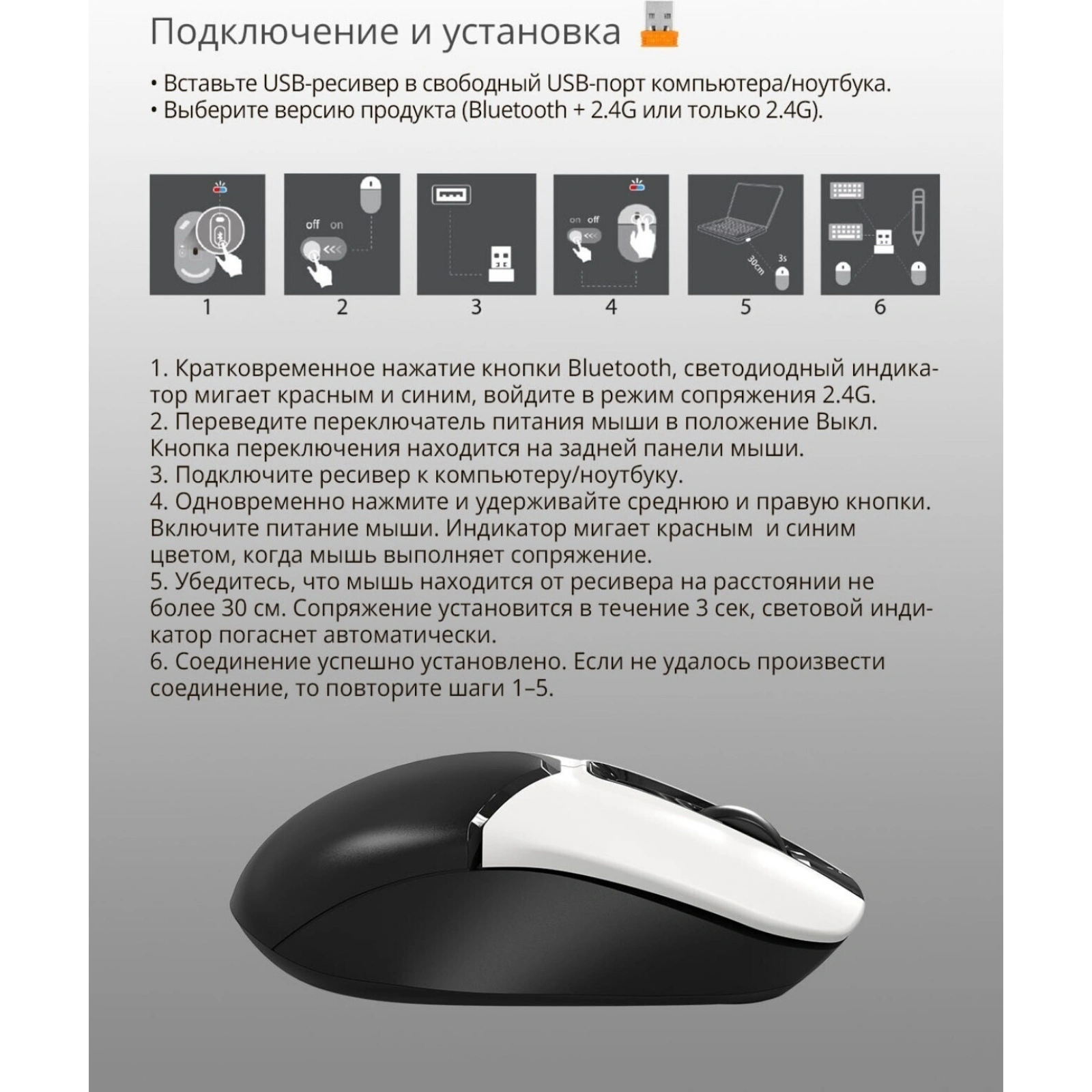 Мышь подключается через радиоканал или Bluetooth, предоставляя свободу выбора и простоту настройки. Радиус действия беспроводной связи составляет до 10 метров, что позволяет удобно использовать её даже на большом расстоянии от компьютера. Питается устройство от одного элемента типа АА, что обеспечивает длительную автономную работу.
