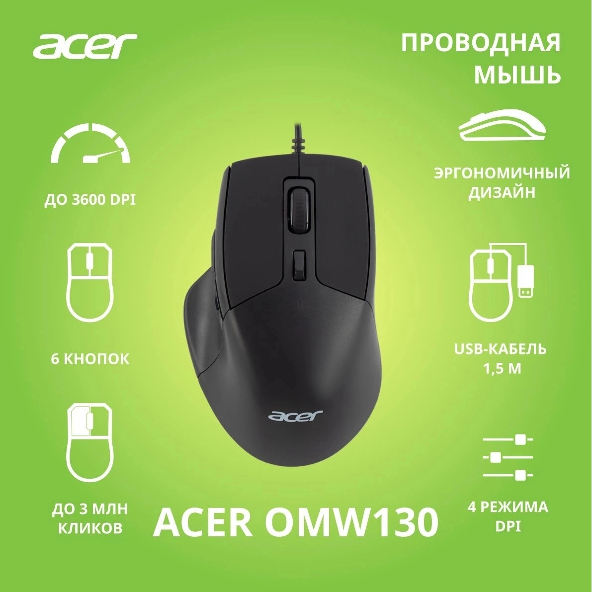Acer представляет универсальную компьютерную мышь, идеальную для пользователей, которым важны производительность и комфорт. Эта черная проводная мышь оснащена оптическим сенсором с разрешением 3600 dpi, что обеспечивает точное и быстрое откликание на все ваши движения, делая ее отличным выбором для работы, учебы и развлечений.