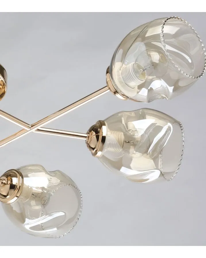 Универсальная модель для интерьеров различной тематики.Стеклянные плафоны золотистого цвета обеспечивают красивый светПотолочный светильник компактного размера подойдут для стандартных потолков.Заменяемые источники света удобны в эксплуатации.