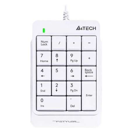 Числовой блок A4 Fstyler FK13P очень легкий, практически не ощущается в ладони. Блок сделан из водонепроницаемого белого пластика, что для любителей посидеть за ноутбуком с кружкой чая или кофе станет приятным бонусом. Удобное и привычное расположение цифр позволит, не глядя, использовать блок. На числовом блоке A4 Fstyler FK13P отсутствует кириллица, что не делает блок менее удобным. При помощи USB-провода блок может быть подсоединен к ноутбуку или любому ПК. Кабель имеет длину 1.5 м, что позволяет расположить его там, где будет предпочтительнее самому пользователю.