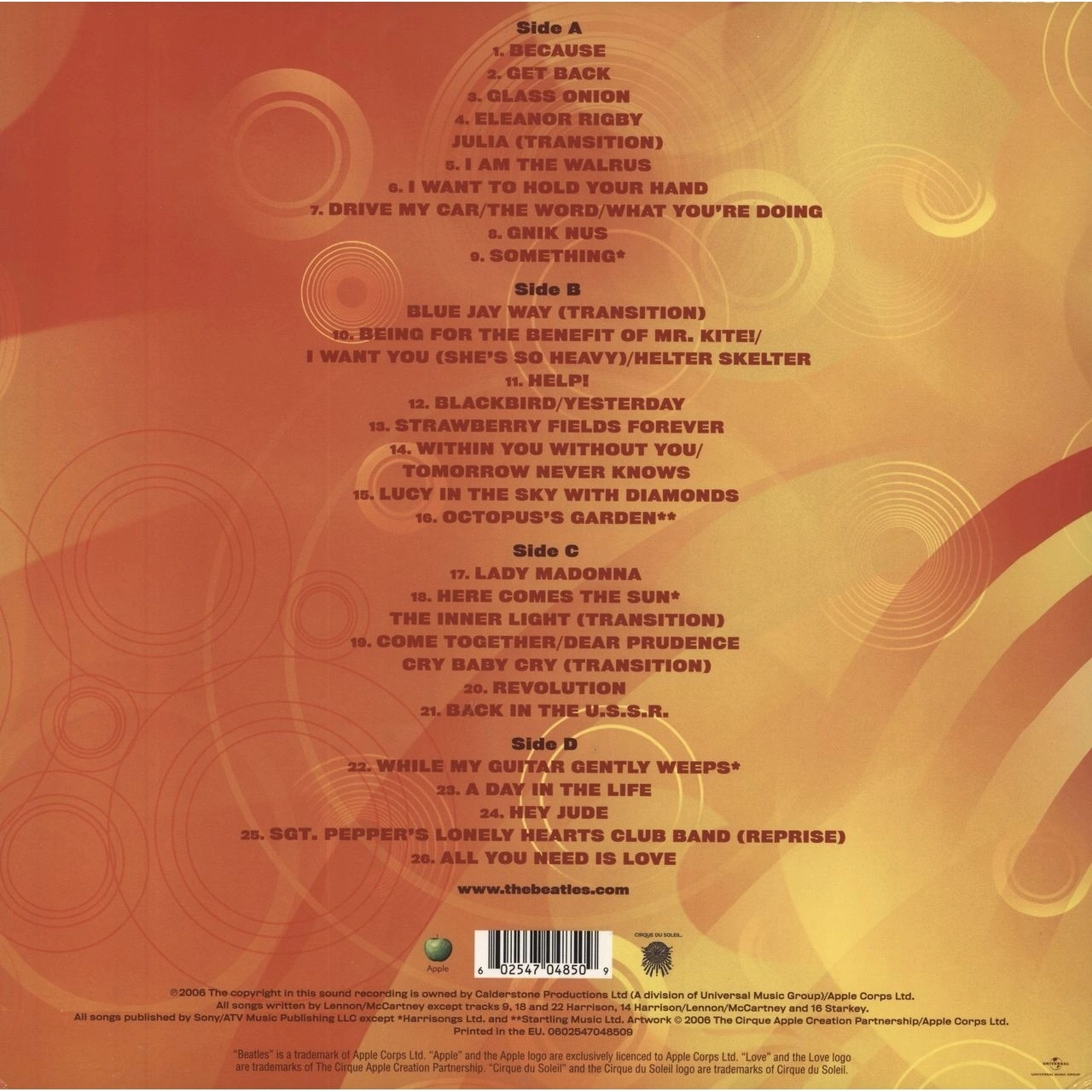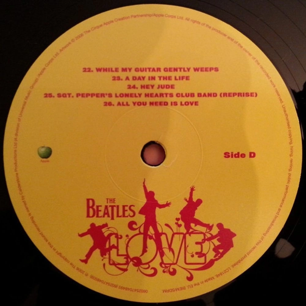 Стиль: Rock & Roll, Pop Rock, Psychedelic Rock, Soundtrack, Beat. A1 Because 2:44. A2 Get Back 2:05. A3 Glass Onion 1:20. A4 Eleanor Rigby / Julia (Transition) 3:05. A5 I Am The Walrus 4:28. A6 I Want To Hold Your Hand 1:22. A7 Drive My Car / The Word / What Youre Doing 1:54. A8 Gnik Nus 0:55. A9 Something 3:29. B1 Blue Jay Way (Transition). B2 Being For The Benefit Of Mr. Kite! / I Want You (Shes So Heavy) / Helter Skelter 3:22. B3 Help! 2:18. B4 Blackbird / Yesterday 2:31. B5 Strawberry Fields Forever 4:31. B6 Within You Without You / Tomorrow Never Knows 3:07. B7 Lucy In The Sky With Diamonds 4:10. B8 Octopuss Garden 3:18. C1 Lady Madonna 2:56. C2 Here Comes The Sun / The Inner Light (Transition) 4:18. C3 Come Together / Dear Prudence / Cry Baby Cry (Transition) 4:45. C4 Revolution 2:14. C5 Back In The U. S. S. R. 1:53. D1 While My Guitar Gently Weeps 3:46. D2 A Day In The Life 5:08. D3 Hey Jude 3:58. D4 Sgt. Peppers Lonely Hearts Club Band (Reprise) 1:22. D5 All You Need Is Love 3:38.