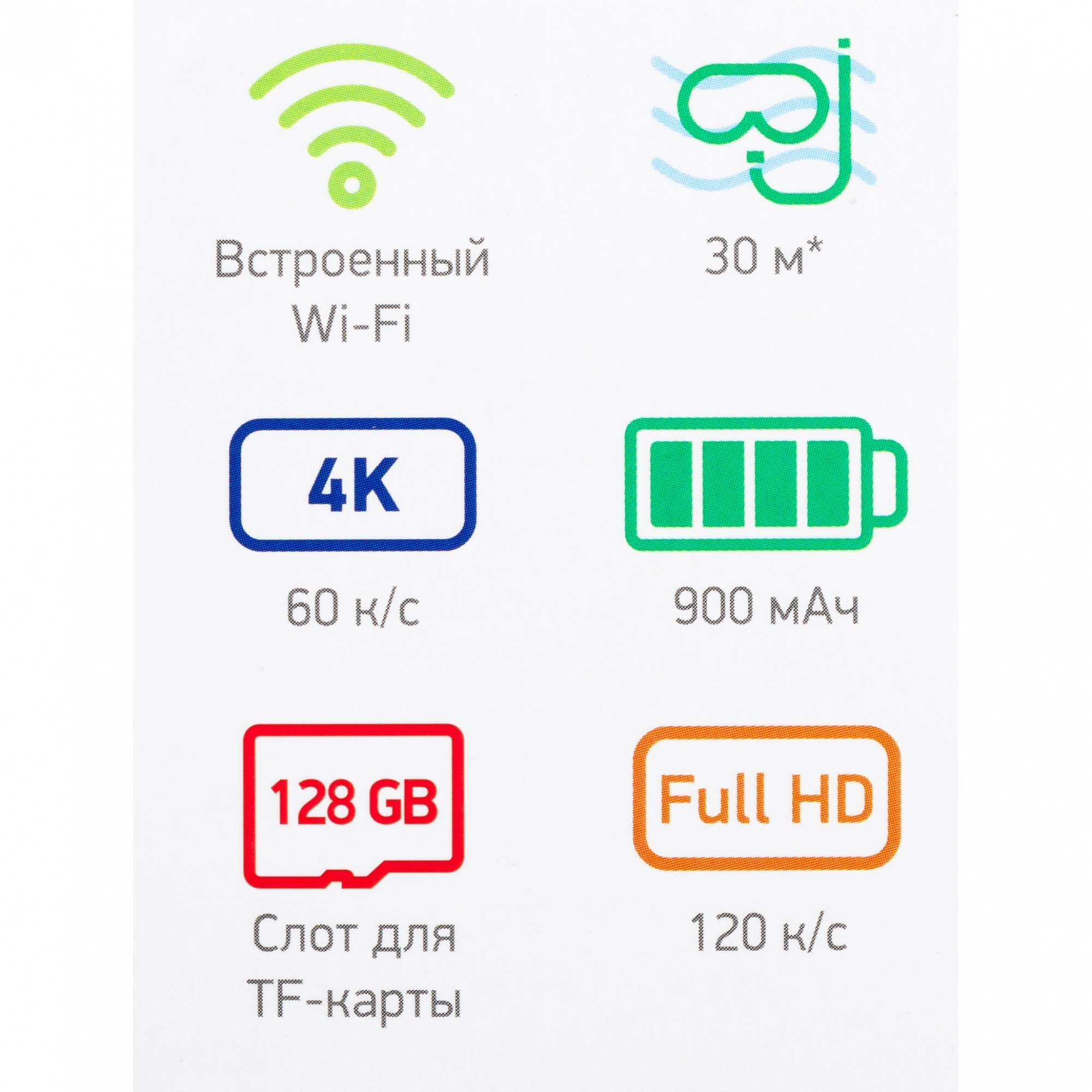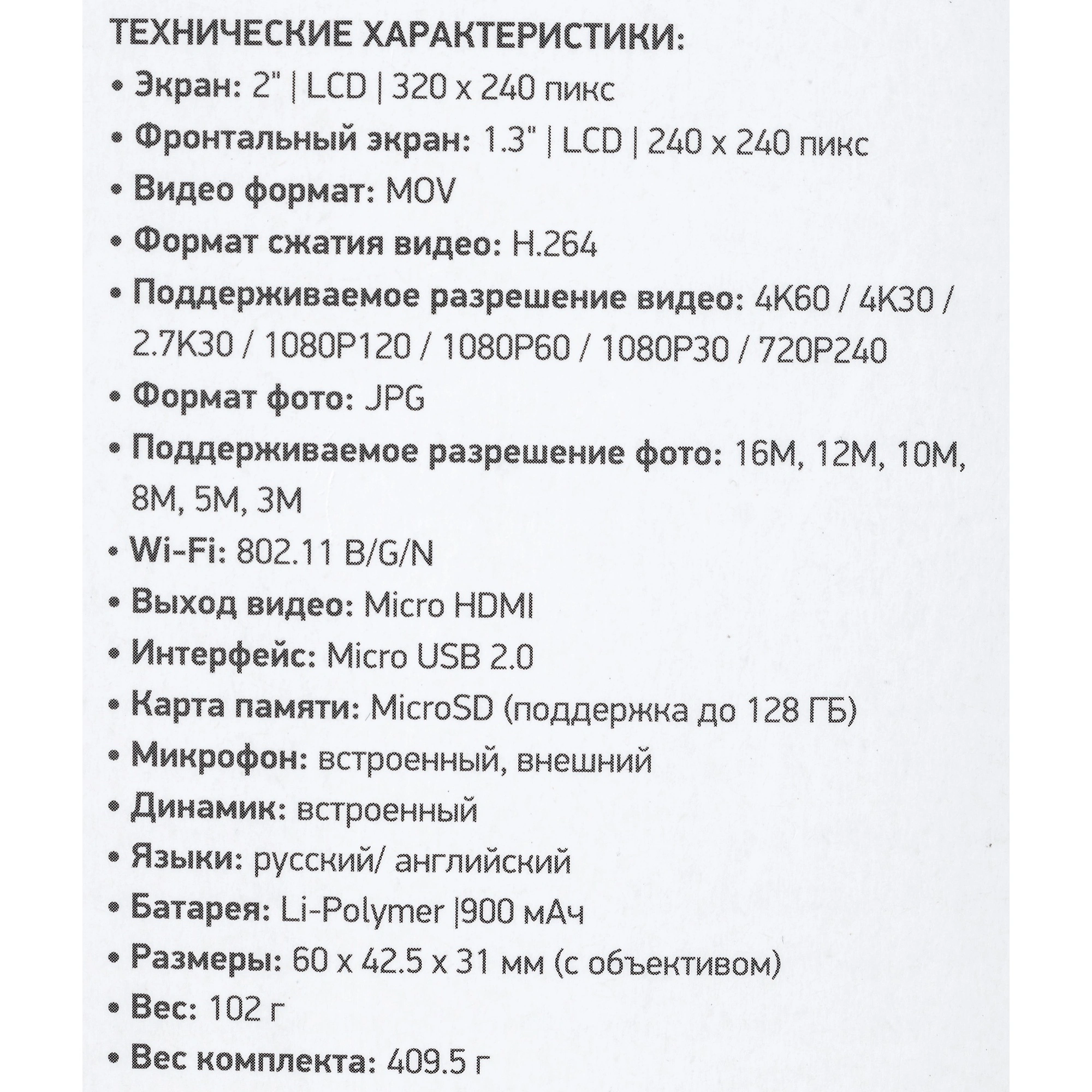 Камера поддерживает карты памяти формата microSD с максимальным объёмом до 128 Гб, что предоставляет достаточно места для хранения множества кадров. Аккумулятор ёмкостью 900 мАч предоставляет длительное время работы, позволяя непрерывно запечатлевать ваши приключения.