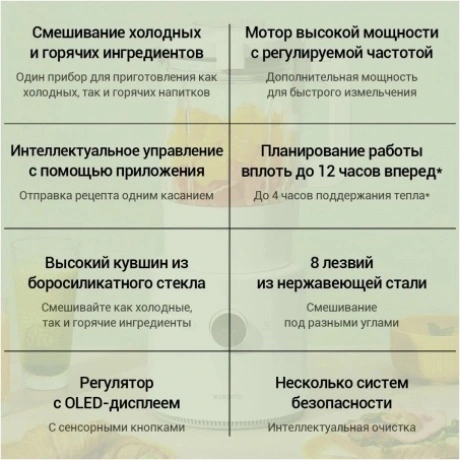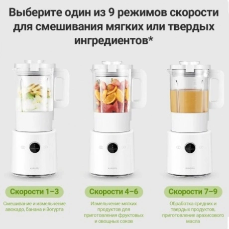 Блендер Xiaomi Smart Blender EU BHR5960EU оснащен 9 режимами работы, которые позволяют смешивать на разных скоростях как мягкие, так и твердые ингредиенты. Механическое управление. Для выбора режима работы достаточно повернуть ручку на корпусе блендера. Ручка также выполняет функцию дисплея. А благодаря сенсорным клавишам можно выставить расписание или отменить выбранный режим. 8 лезвий из нержавеющей стали. Толстые, острые, зазубренные лезвия из нержавеющей стали позволяют измельчать под разными углами и с легкостью смешивать даже самые твердые ингредиенты. Вместимость. В чашу блендера помещается до 1200 мл горячих напитков и до 1600 мл холодных напитков за один раз. С легкостью готовьте полезные смузи, свежевыжатый сок и дробленый лед. Двигатель высокой мощности. Мощный двигатель обеспечивает дополнительный крутящий момент для тщательного смешивания. Стабильная скорость вращения. Двигатель с переменной частотой оснащен датчиком Холла для контроля скорости в режиме реального времени, а мощность может автоматически регулироваться в зависимости от нагрузки, чтобы предотвратить замедление при высокой нагрузке и обеспечить надежное смешивание. Приложение Mi Home/Xiaomi Home. Подключитесь к приложению Mi Home/Xiaomi Home, чтобы запланировать приготовление с отсрочкой до 12 часов или начать приготовление любимых блюд и напитков удаленно или отправить рецепты из облака.
