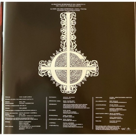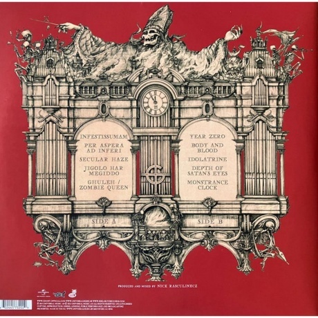 "Infestissumam" - переиздание второго студийного альбома шведской хэви-метал-группы Ghost, выпущенного в 2013 году. Он дебютировал на 28 позиции в чарте Billboard 200 и лидировал в сайте "Billboard Hard Rock Albums". В 2014 году выиграл премию Грэмми за "лучший хард-рок/метал альбом". Релиз представлен на черном виниле и содержит 12-страничный буклет. Ghost - шведская дум-метал группа из Линчёпинга, основанная в 2006-м году. Отличительной чертой Ghost является сценический образ музыкантов: семяро участников, именуемых "Nameless Ghouls" (Безымянные Упыри или Безымянные Оборотни, как принято их называть в русскоязычной фан-среде), выступают в одинаковых костюмах и масках, скрывающими их лица, а вокалист (Papa Emeritus) в одежде кардинала и раскрашенным под череп лицом. Настоящие имена участников неизвестны. Основа лирики - сатанинская и оккультная тематика. В музыкальном плане коллектив похож на такие группы как Black Sabbath, Blue Oyster Cult, Mercyful Fate и Witchfinder General.