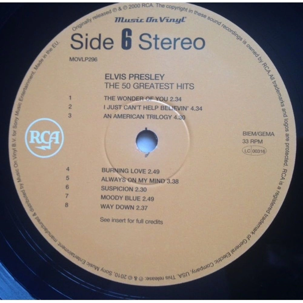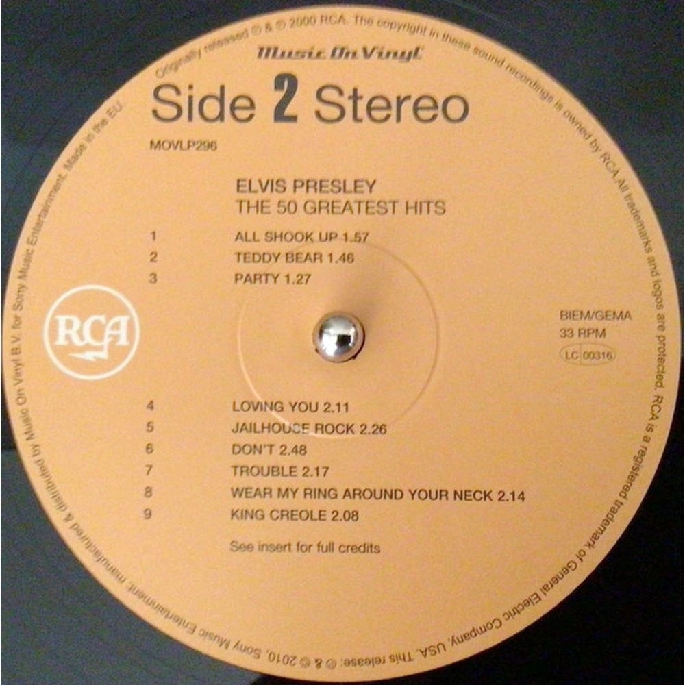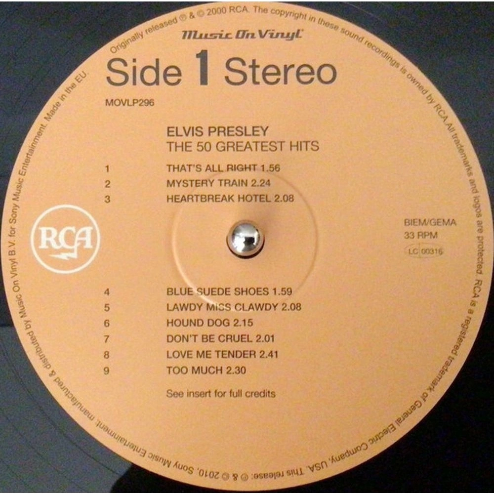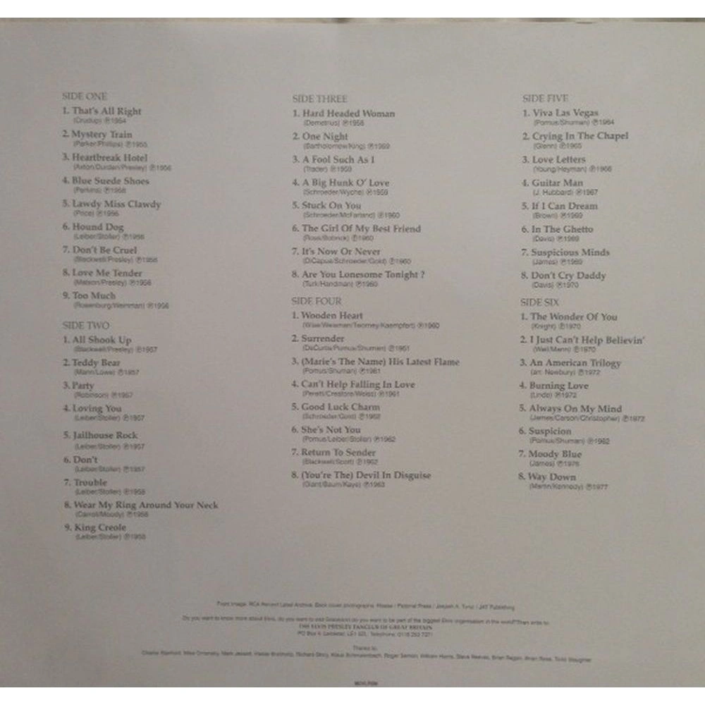 Лицензионное издание, выпущенное на виниле. В альбом вошли следующие композиции: That's All Right, Mystery Train, Heartbreak Hotel, Blue Suede Shoes, Lawdy Miss Clawdy, Hound Dog, Don't Be Cruel, Love Me Tender, Too Much, All Shook Up, Teddy Bear, Party, Loving You, Jailhouse Rock, Don't, Trouble, Wear My Ring Around Your Neck, King Creole, Hard Headed Woman, One Night, A Fool Such As I, A Big Hunk O' Love, Stuck On You, The Girl Of My Best Friend, It's Now Or Never, Are You Lonesome Tonight?, Wooden Heart, Surrender, (Marie's The Name) His Latest Flame, Can't Help Falling In Love, Good Luck Charm, She's Not You, Return To Sender, (You're The) Devil In Disguise, Viva Las Vegas, Crying In The Chapel, Love Letters, Guitar Man, If I Can Dream, In The Ghetto, Suspicious Minds, Don't Cry Daddy, The Wonder Of You, I Just Can't Help Believin', An American Trilogy, Burning Love, Always On My Mind, Suspicion, Moody Blue, Way Down