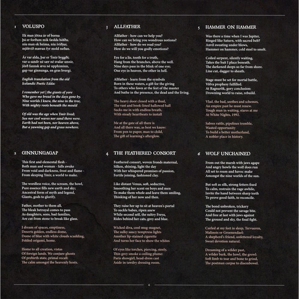 Лицензионное издание, выпущенное на виниле. В альбом вошли следующие композиции: Voluspo, Ginnungagap, Allfather, The Feathered Consort, Hammer On Hammer, Wolf Unchained, The Perfect One, Trickster (And The Mistletoe), Cornucopia, The Navigators, Guardian's Watch, Ithavoll