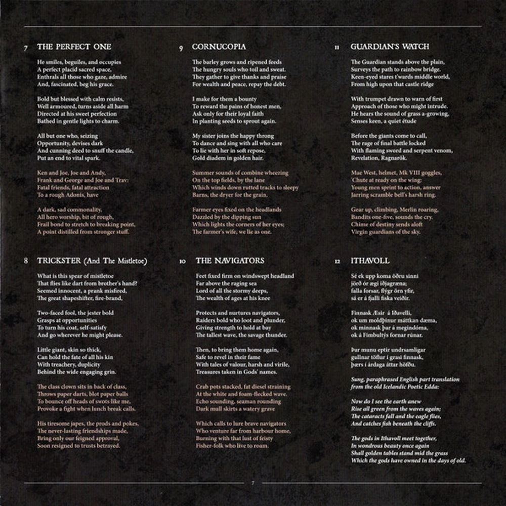 Voluspo, Ginnungagap, Allfather, The Feathered Consort, Hammer On Hammer, Wolf Unchained, The Perfect One, Trickster (And The Mistletoe), Cornucopia, The Navigators, Guardian's Watch, Ithavoll