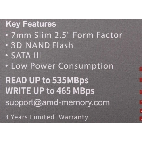 1024 ГБ SSD-накопитель AMD Radeon R5 Series [R5SL1024G] отличается большой емкостью и высоким быстродействием, благодаря чему данная модель может стать отличным выбором не только для домашних и офисных систем, но и игровых и рабочих станций. В основе диска используются первоклассные компоненты и производительный микропроцессор, что вкупе с интерфейсом SATA III, который используется для подключения к материнской плате, обеспечивает запись и чтение на скорости до 460 и 540 МБ/с соответственно. Помимо этого модель отличается высокой надежностью и отказоустойчивостью, ее ресурс работы достигает 300 TBW. Среднее время наработки на отказ составляет 1.5 млн ч. SSD-накопитель AMD Radeon R5 Series [R5SL1024G] отличается не только своей производительностью, но и компактными размерами. Модель выполнена в корпусе формата 2.5” и может легко устанавливаться как в различные системные блоки и моноблоки, так и в ноутбуки. Также при помощи отдельно докупаемого бокса диск может использоваться в качестве внешнего устройства для записи и хранения данных.
