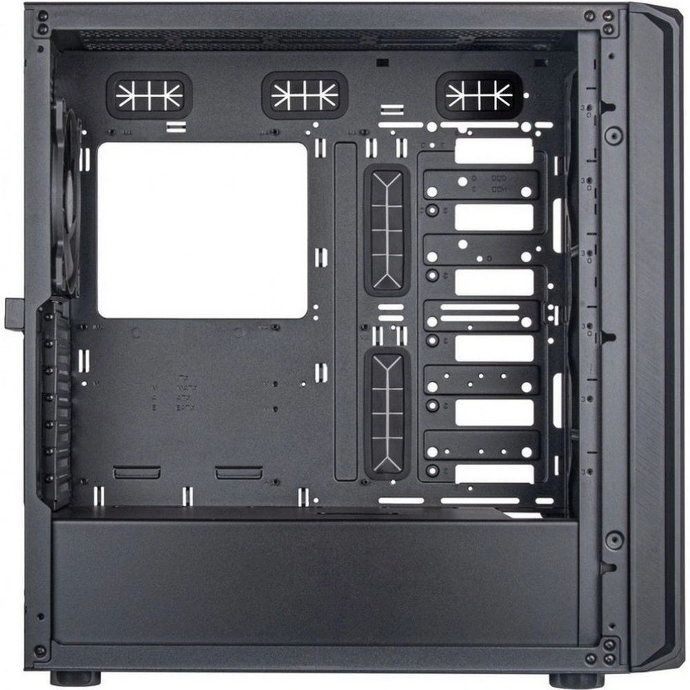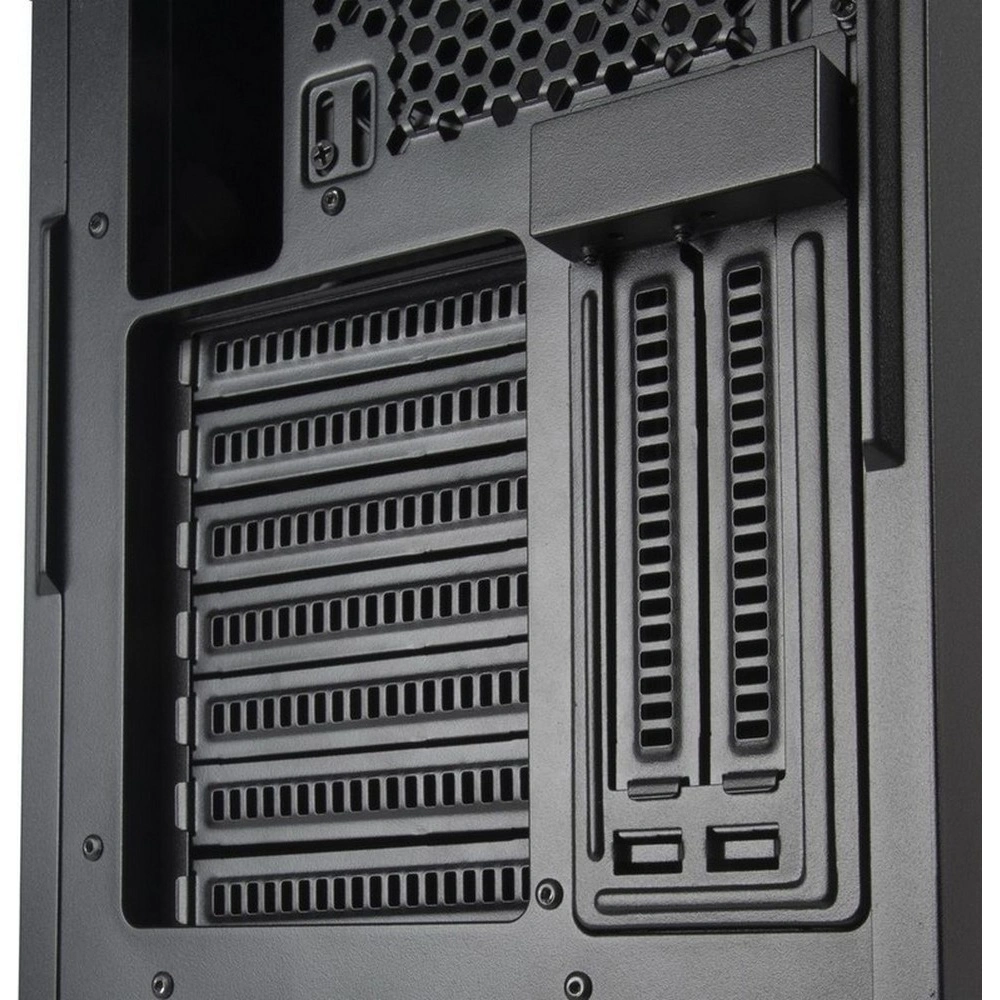 Корпус оснащён девятью слотами расширения, предоставляя множество возможностей для подключения дополнительных карт и устройств. Для хранения данных предусмотрены два внутренних отсека для накопителей формата 2,5 дюйма и два для 3,5-дюймовых устройств, а также три отсека размером 5,25 дюйма для установки различных приводов или аксессуаров.