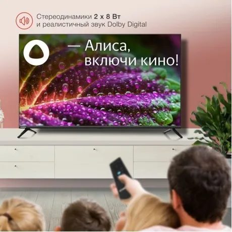 Обеспечивает комфортный просмотр благодаря 43-дюймовому экрану с разрешением 1920x1080 пикселей, на котором отображается детализированная картинка с реалистичной цветопередачей. Имеет черный цвет корпуса и изящную подставку, благодаря чему легко впишется в любой интерьер.