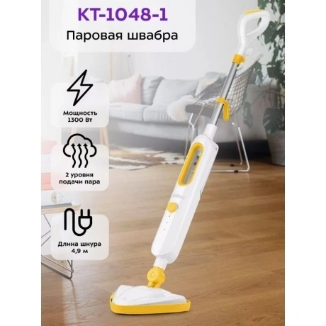 Паровая швабра КТ-1048 — универсальное устройство, которое поможет избавиться от пыли и грязи с помощью мощной струи пара, а также продезинфицирует поверхность. Высокая температура пара способствует процессу очистки любых загрязнений. Плавная регулировка уровня подачи пара позволяет настраивать интенсивность работы устройства. Это очень удобно при очистке разных типов поверхностей с разным уровнем загрязнения. Чем сильнее загрязнение, тем больше пара потребуется. Швабра КТ-1048 оснащена специальной конструкцией, благодаря которой вы сможете легко вымыть пол под мебелью. Принцип действия парогенератора основан на воздействии горячего пара на загрязнения. Пар проникает внутрь загрязнения, размягчая и растворяя его. Напольная щётка закреплена на специальном шаровом шарнире с наклоном в двух плоскостях, что делает швабру КТ-1048 очень маневренной и значительно облегчает уборку. Насадка для пола надёжно фиксируется шурупом, который идёт в комплекте. Во время работы парогенератора вода из резервуара проходит через специальный фильтр. Швабра оснащена резервуаром для воды ёмкостью 360 мл, что позволит убрать большую площадь сразу. Конструкция удобно разбирается, чтобы наполнить и вымыть резервуар. Стакан для наливания воды служит для удобного и безопасного наливания воды в резервуар. В комплекте идут рамка для ковра, 2 тряпки для пола, удлинительная трубка, ручка, шуруп для фиксации насадки и резервуар для воды с крышкой. Помимо гладких поверхностей, паровая швабра также убирает ковровые покрытия с недлинным ворсом. Комплектацией швабры предусмотрена рамка, она крепится на щётку и тряпку. Рамка облегчает скольжение щётки по ковру и предотвращает задирание краёв тряпки. Паровая швабра КТ-1048 обладает функцией вертикальной парковки, так что вам необязательно ставить её в шкаф. На удлинительной ручке предусмотрены держатели для шнура для ещё более компактного хранения. Длина шнура – 4.9 метра.