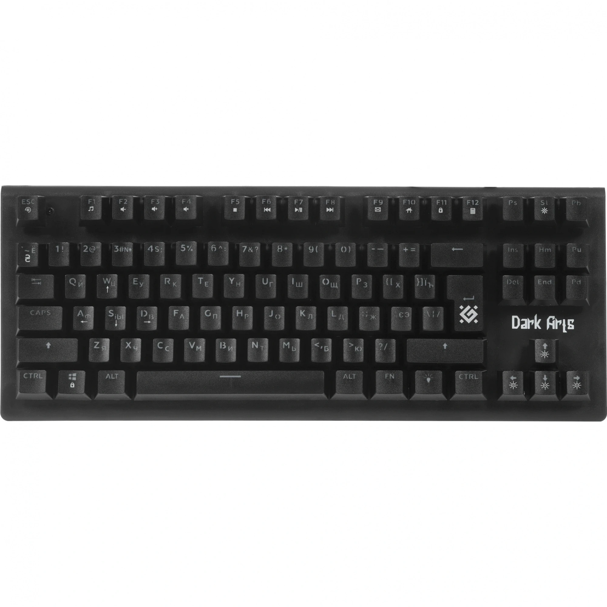 Клавиатура проводная Defender Dark Arts GK-375 [45375] – компактная игровая модель, которая поможет сэкономить место на столе. Дизайн скелетон выполнен в формате 80% (без цифрового блока). Имеется 87 клавиш, среди которых вы найдете ряд Fn и отдельную клавишу для управления подсветкой.