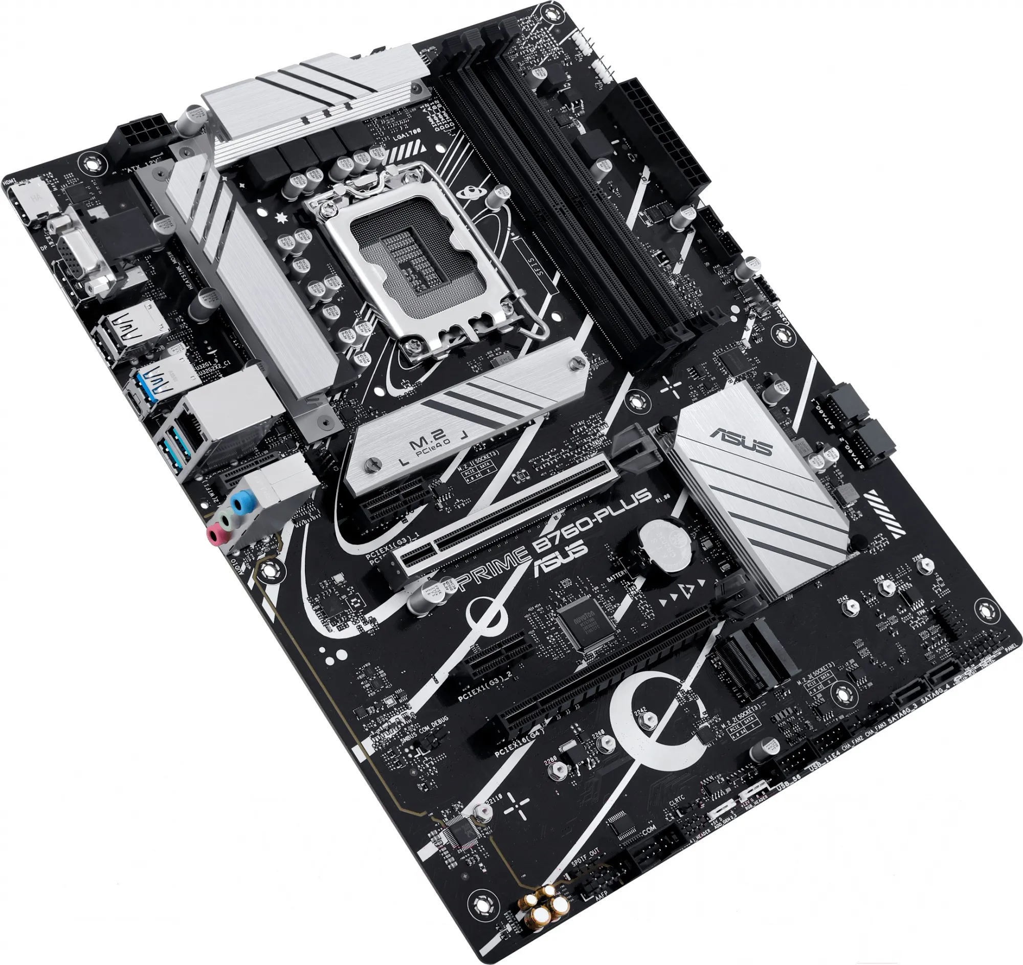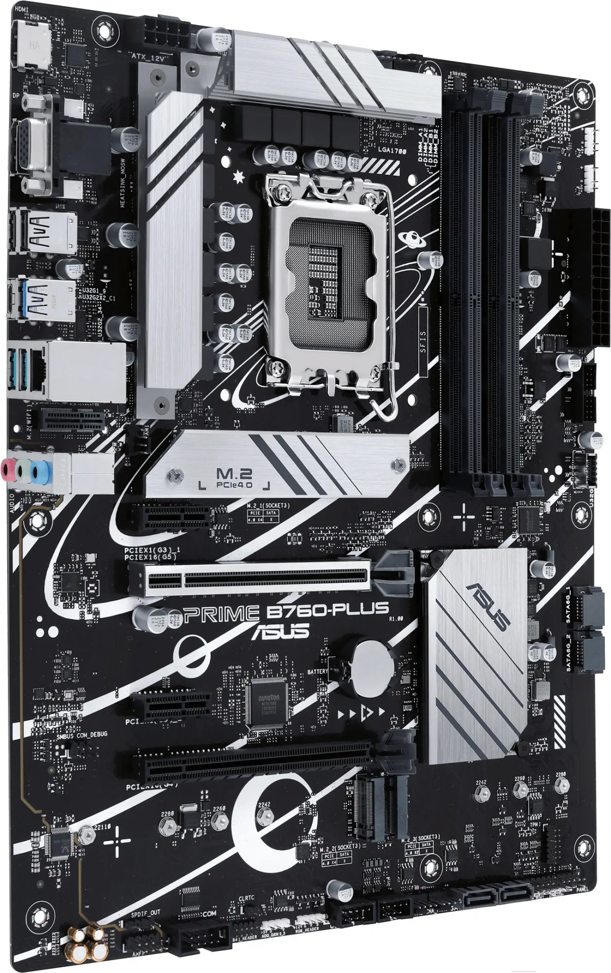 Материнская плата ASUS PRIME B760-PLUS линейки Prime примечательна серебристыми охлаждающими элементами и стабильностью в режиме круглосуточной нагрузки. Она протестирована на эксплуатацию в условиях работы 24/7, поэтому обеспечивает безотказную производительность. Плата выполнена в форм-факторе Standard-ATX и поддерживает установку процессора Intel с сокетом LGA 1700.