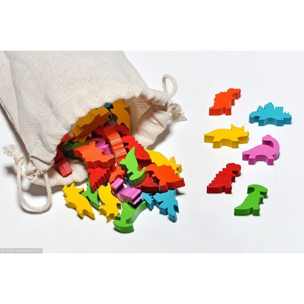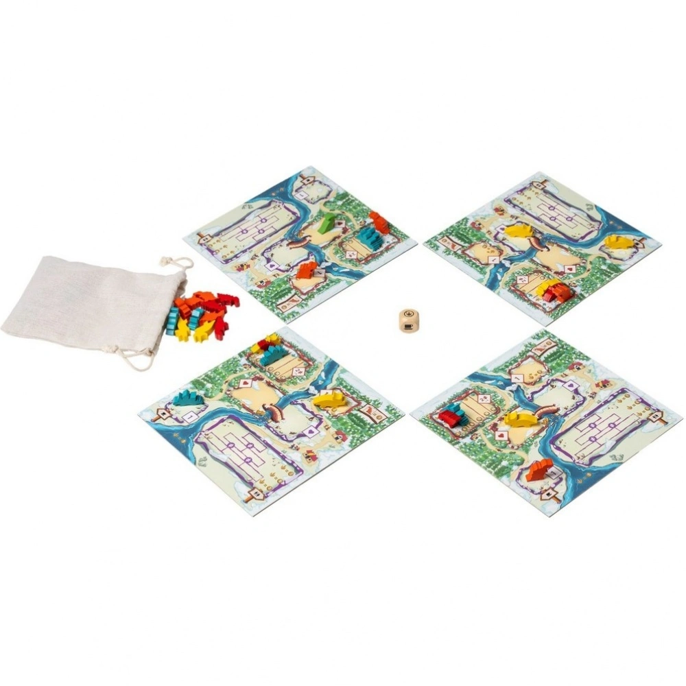 5 двухсторонних планшетов динопарка(одна сторона летняя, другая — зимняя), 60 фигурок динозавров (по 10 каждого вида), 1 кубик места, 1 мешочек, правила