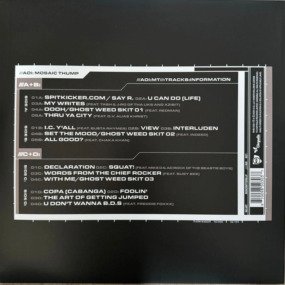 Art Official Intelligence: Mosaic Thump — пятый студийный альбом De La Soul, выпущенный 8 августа 2000 года. Среди гостей альбома — Редман, Таш и Джей-Ро из Tha Liks, Xzibit, Busta Rhymes, Mike D и Ad. Рок из Beastie Boys, Busy Bee, Фредди Фокса и Чаки Хана. Mosaic Thump снова вернул De La Soul на территорию чартов благодаря хит-синглам «Oooh.» и «All Good?». «Oooh» был номинирован на премию Source Award, а альбом был номинирован на «Грэмми» за лучшее рэп-исполнение дуэта или группы.